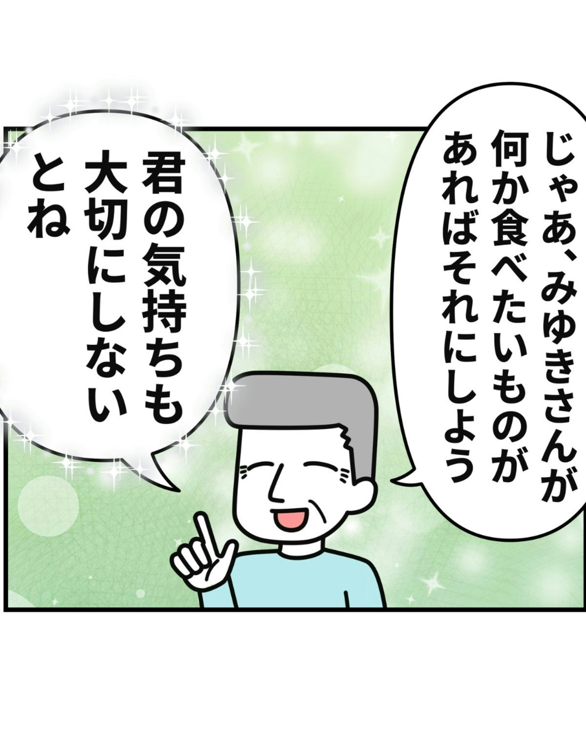 義父は、「ふたりともいつも頑張っているから」という気持ちで、「寿司をとろう」と提案してくれたのでした。そして、みゆきさんの気持ちを尊重してくれました。とても素敵な義父で安心しましたね。