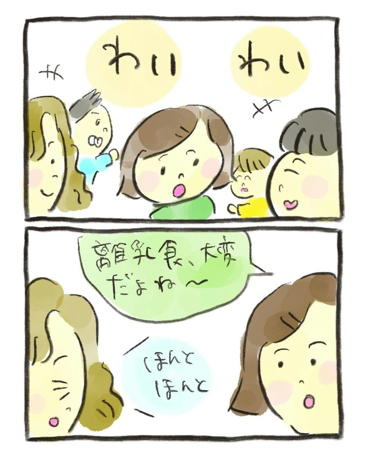 おたんこ助産師さんの友人2人は、子育て中のママ。お互いに離乳食など子どもの話題で盛り上がっています。