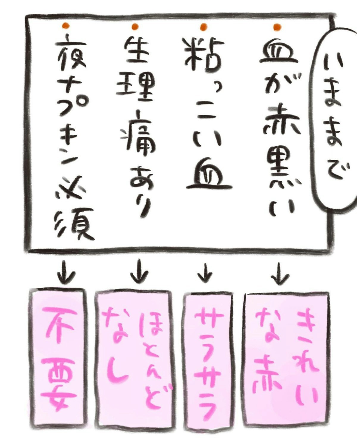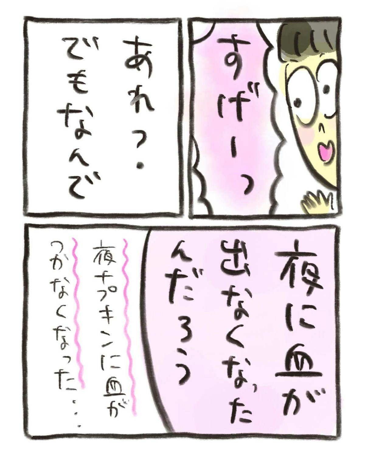 生理中の経血の色や量、さらに生理痛がほぼなくなるなどの変化が表れました。そんななか、おたんこ助産師さんは夜に経血が出なくなったのはなぜかと疑問に思います。