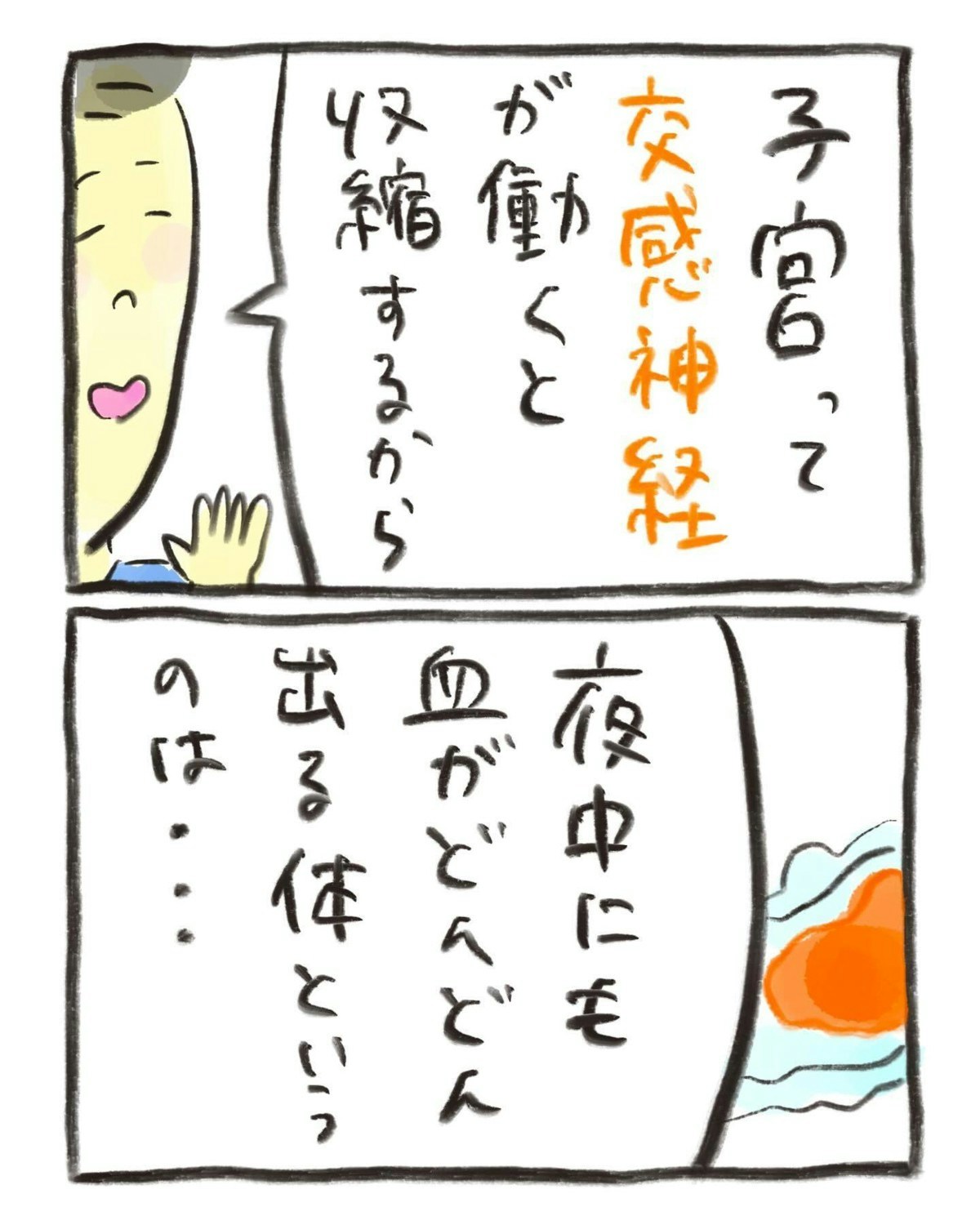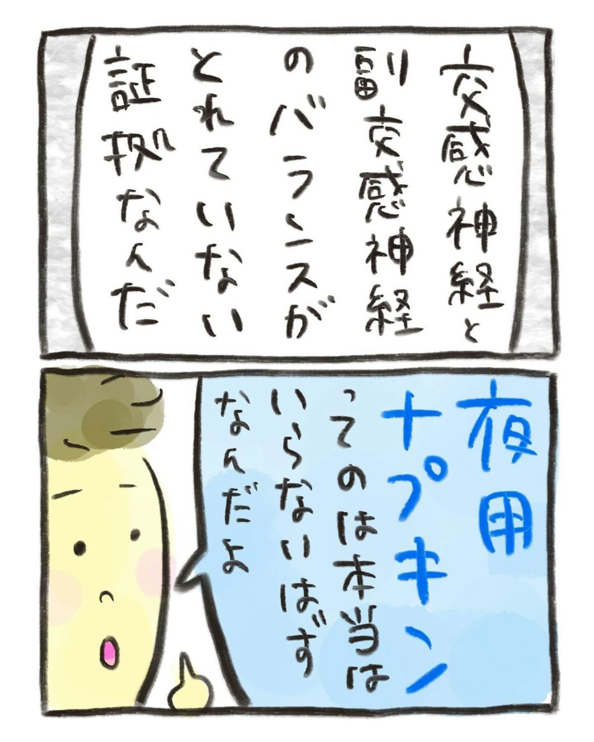 生理中に交感神経、副交感神経のバランスが取れていないと、経血がたくさん出るのだそう。健康体であれば「夜用ナプキン」は使わなくてもいいくらい経血が出ないのです。
