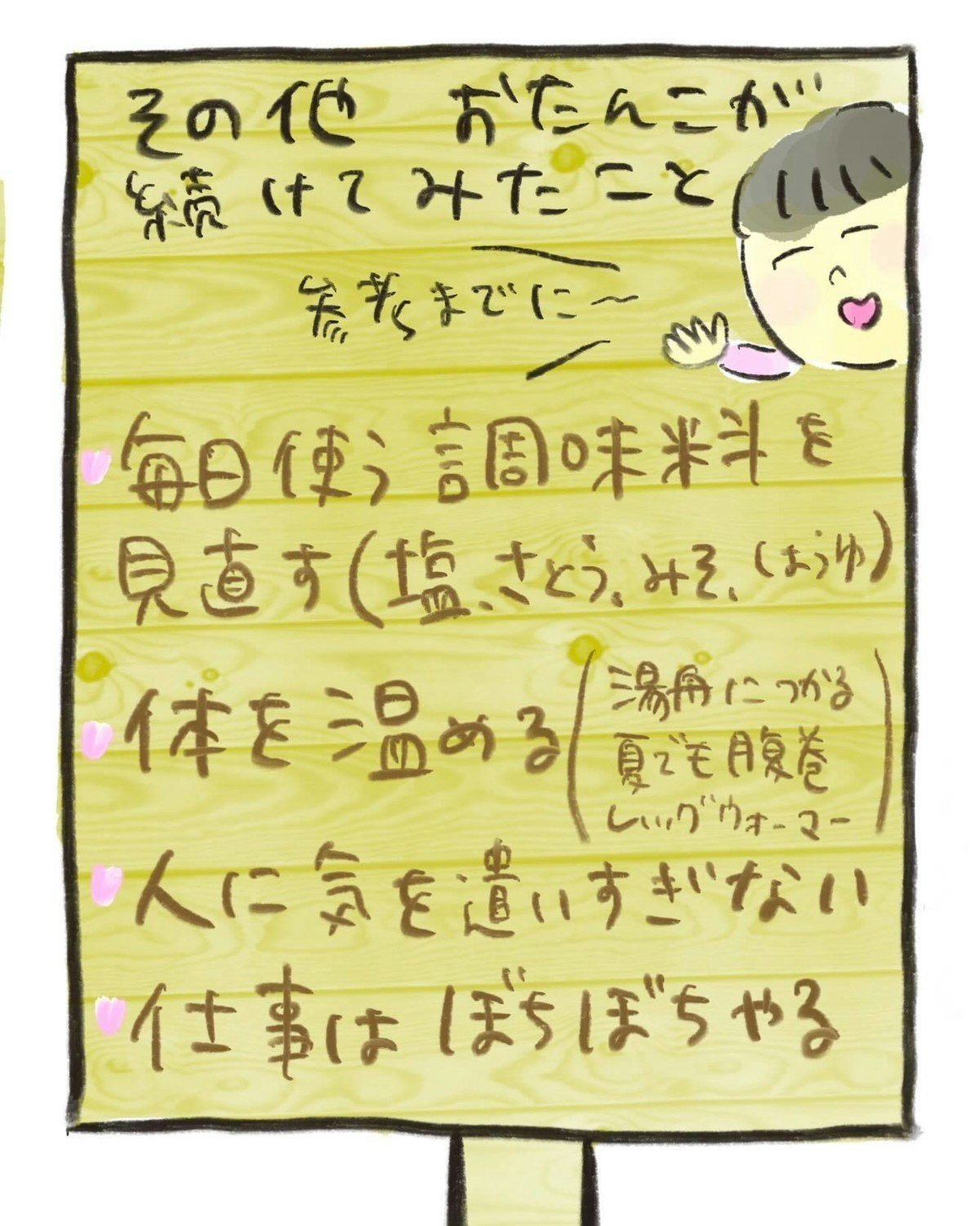 体の声を聴き、体調の変化に気づいたことで「楽しい」気持ちになったおたんこ助産師さん。無理せず実践する方法も考え出し、途中で投げ出すことなく続けられました。