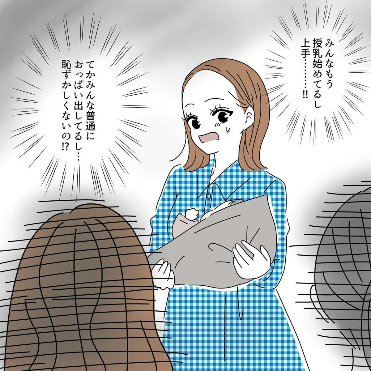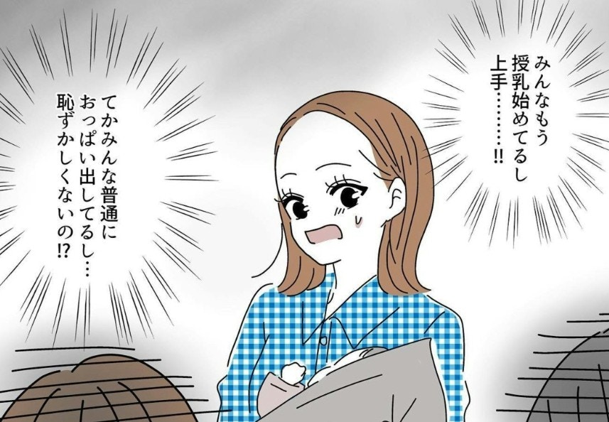 産科の授乳室では、他のママたちが胸を出して授乳に奮闘しているのである意味異様な光景ですよね。初めての授乳室にあっけにとられるタニシさんは授乳を始められるのでしょうか。