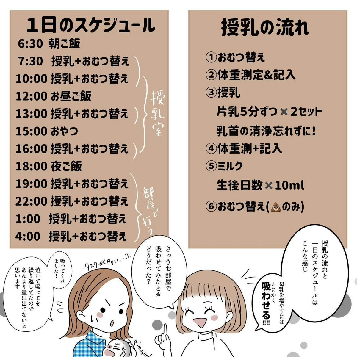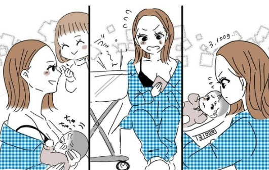 助産師さんの手引きで授乳練習がスタート。次は3時間後に授乳室に行くことになっていたのですが、その間ゆっくりできることはなく、赤ちゃんが泣いたらすぐ授乳練習が始まります。そして3時間後に初めて授乳室を訪れると、他のママたちが胸を出して授乳に奮闘する姿が目に入りびっくりするのでした。