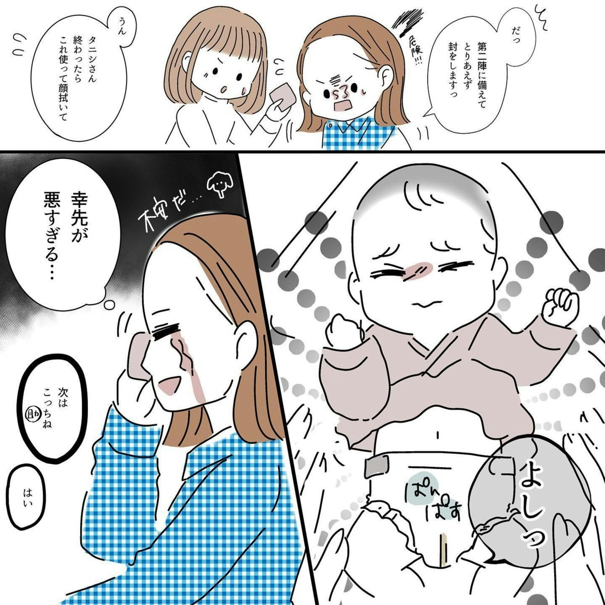 産後の入院中から始まった授乳は、なかなかうまくいかず、焦りや落ち込みを感じる日々だったそうです。退院後に母乳が出るようになったものの、母乳だけのときに赤ちゃんが吐いてしまったことをきっかけに、授乳を見直すことになります。赤ちゃんの吐き戻しは珍しいことではありませんが、当時のタニシさんには、そのでき事を気持ちの余裕をもって受け止めることが難しかったといいます。悩んだ末にミルクへ切り替えたことで、少しずつ前向きに育児と向き合えるようになったそうです。
