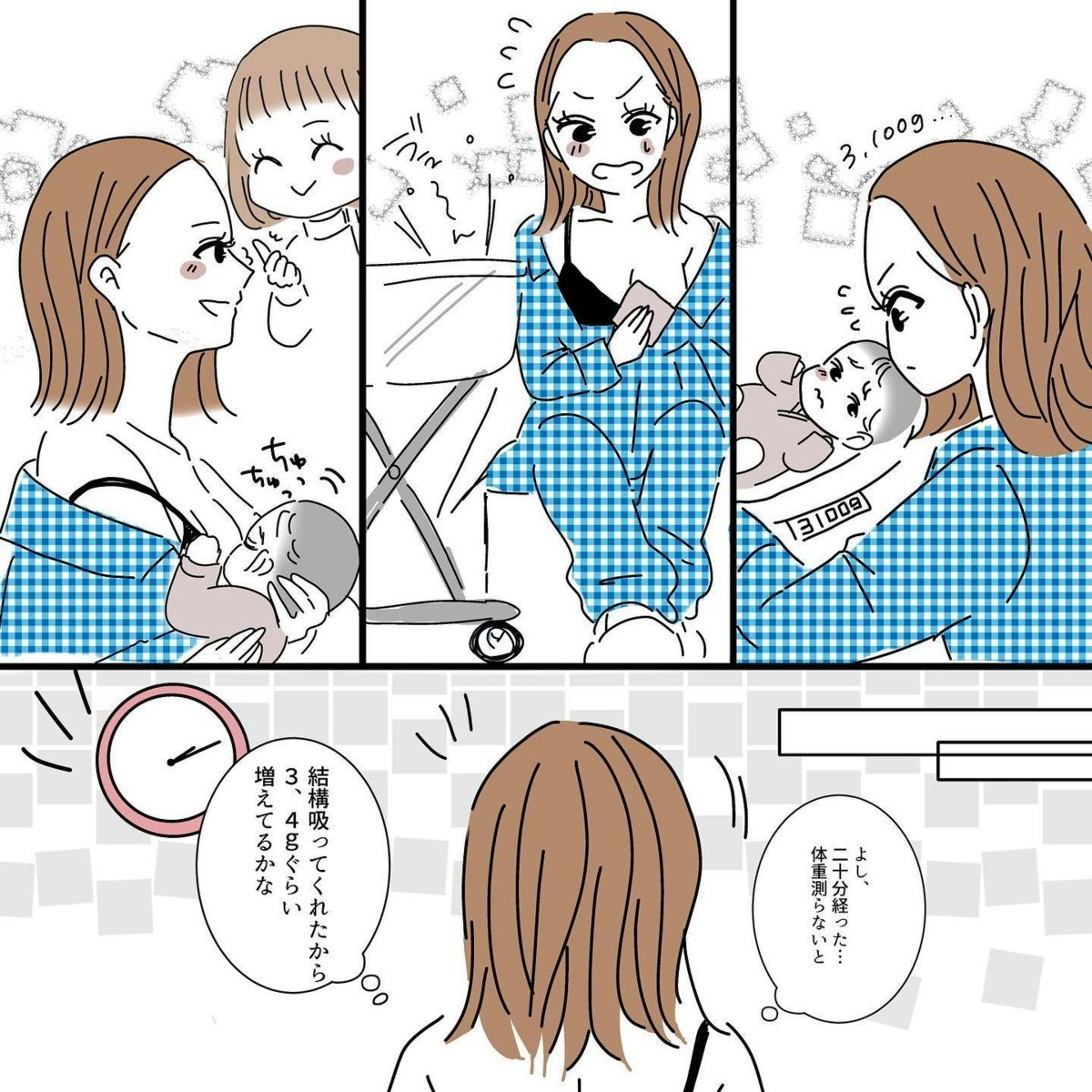 赤ちゃんが吸えるようになったことで、期待して体重を図ってみると増えていないメモリを見て驚くタニシさん。まだ母乳が出ていないということなのでしょうか。