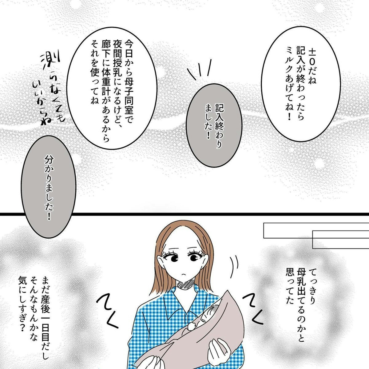 まったく増えていない量りのメモリを見て呆然とするタニシさんに助産師さんが声をかけました。助産師さんも、まだ出ていないとは思っていないようです。