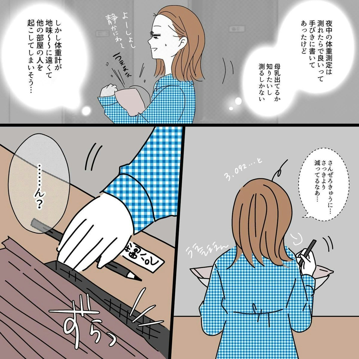 赤ちゃんが順調におっぱいを吸えるようになり、授乳の練習もうまくいっているという実感があったタニシさんは、どのくらい赤ちゃんの体重が増えているか楽しみに量ると、そこには何も変化していないメモリの表示が。