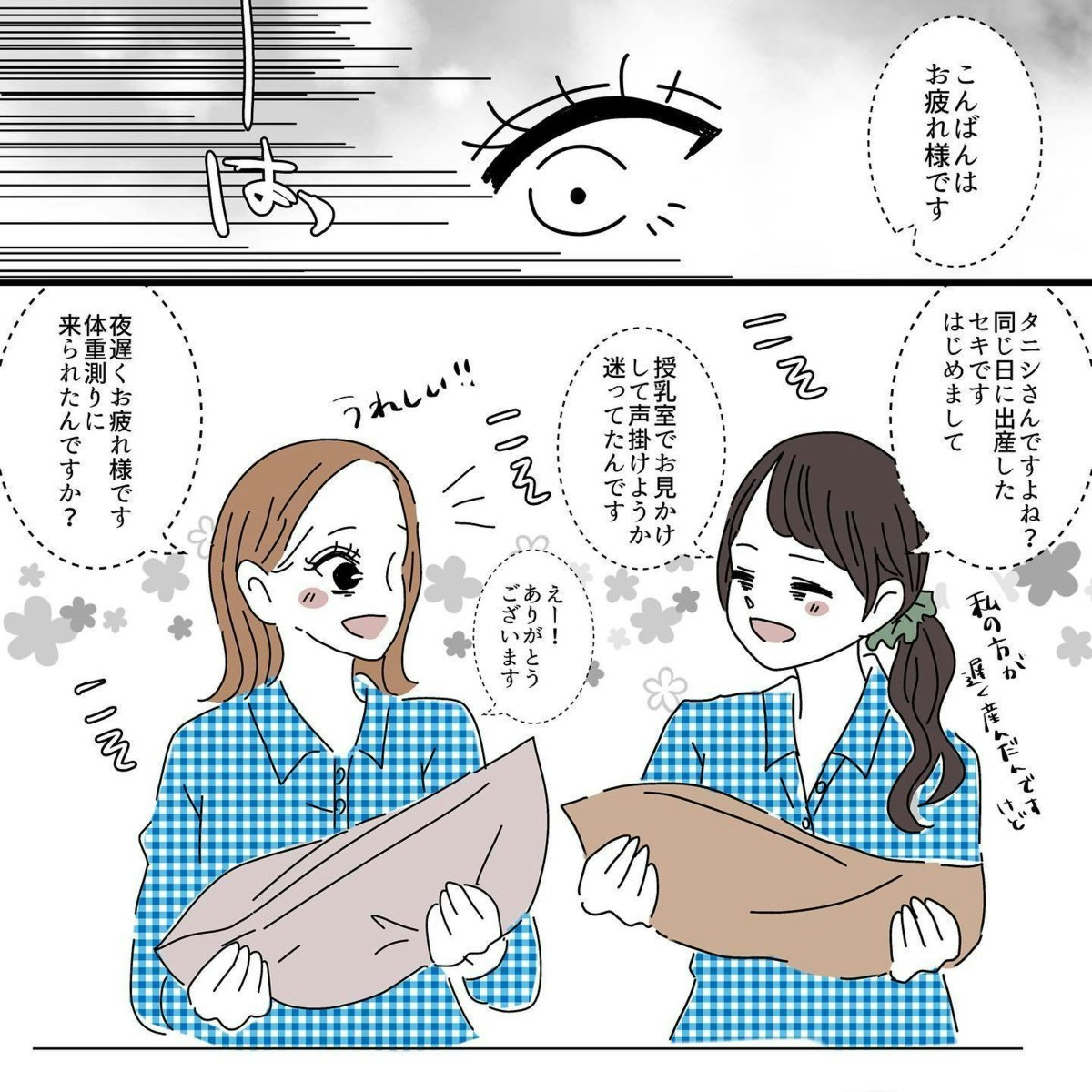 疲れた体を引きづって、体重を量りに来たタニシさんに他のママが話しかけてくれました。孤独が募る赤ちゃんとの夜は、産後のママ同士の会話で心がほぐれたりしますよね。