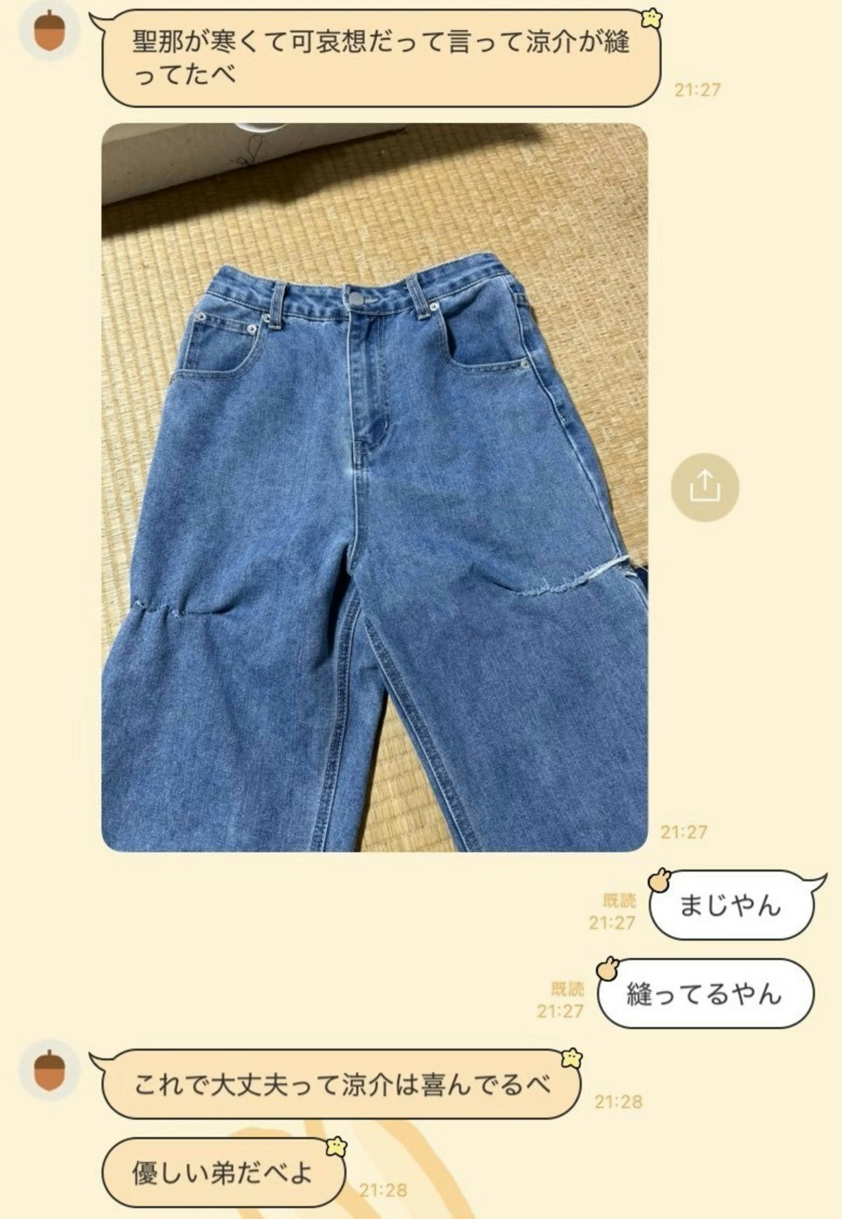 サイドにダメージ入ってるジーンズ、家帰ったら弟(自閉症)にガチでズボン縫われててココ最近で1番笑った 優しすぎるけどおもろすぎる ※3
