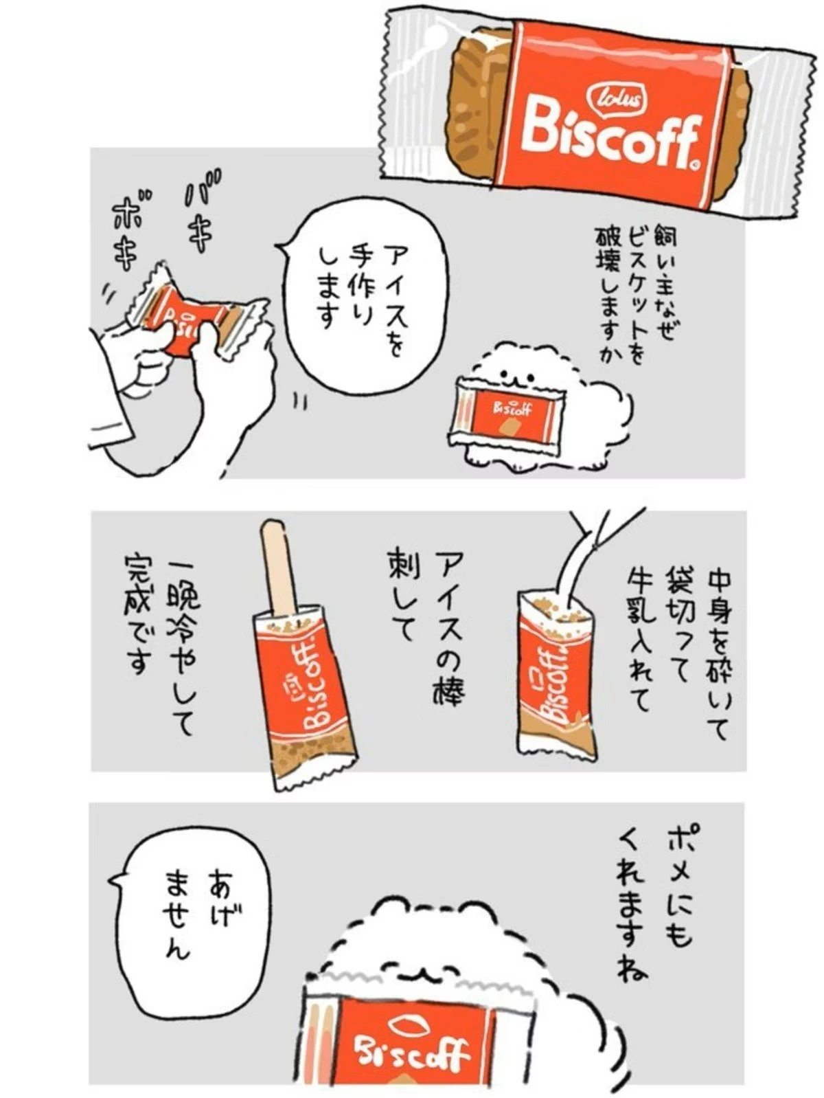 ビスコフを個包装の中で砕き、牛乳を入れてアイスの棒や爪楊枝を刺します。一晩冷やしたら完成です。あまりの手軽さに、すぐにでも試してみたくなってしまいますね。漫画犬さんは固まるまでは冷凍庫内で倒れないよう、コップに4個ほど入れて立たせているそうです。
