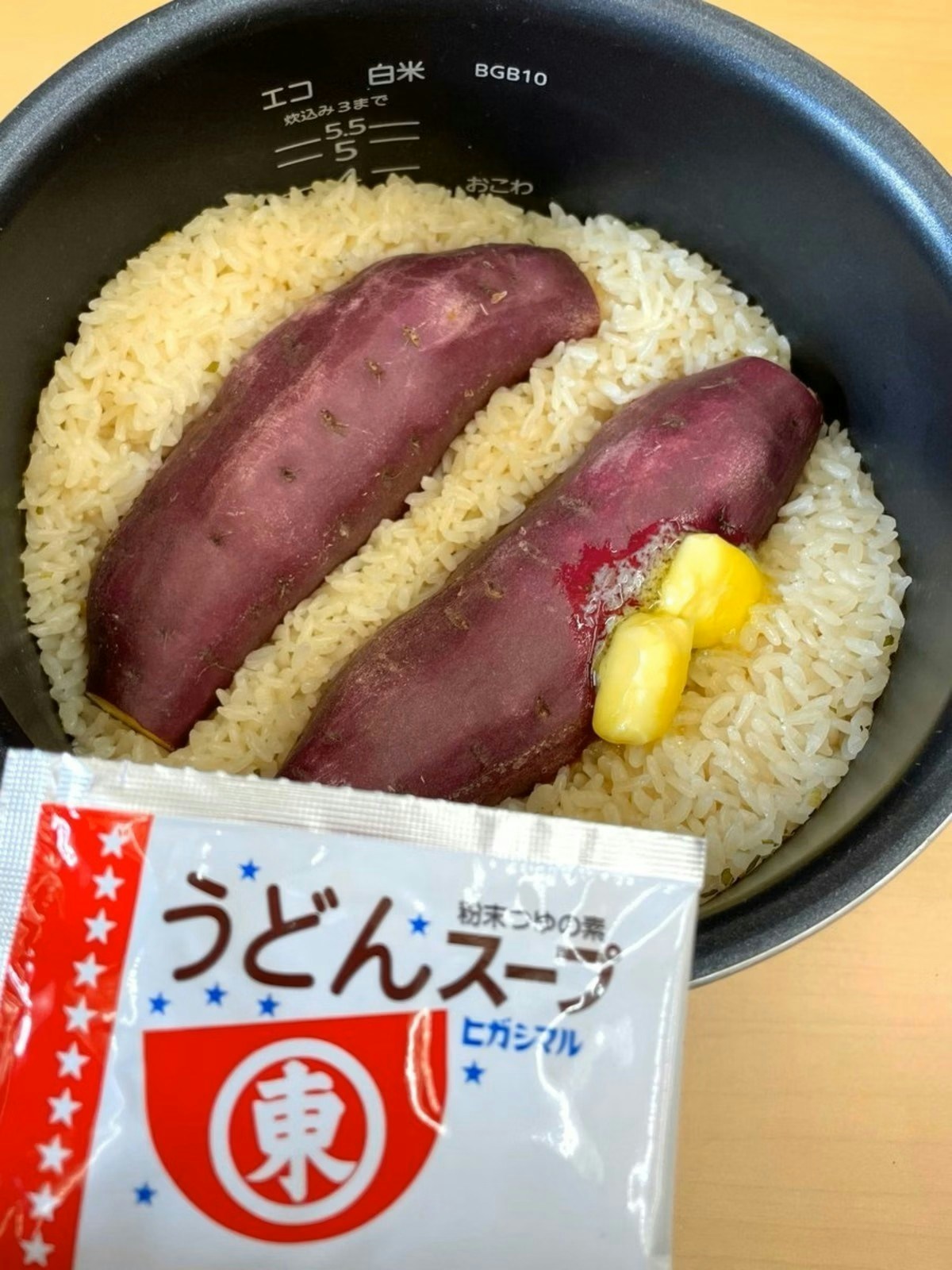 お米2合と水2合分を入れ、うどんスープ2袋とさつまいも2本(約300g)も加え一緒に炊飯。炊き上がったらさつまいもを軽くほぐしながら全体を混ぜ、バター10〜20gも混ぜ込めば完成。