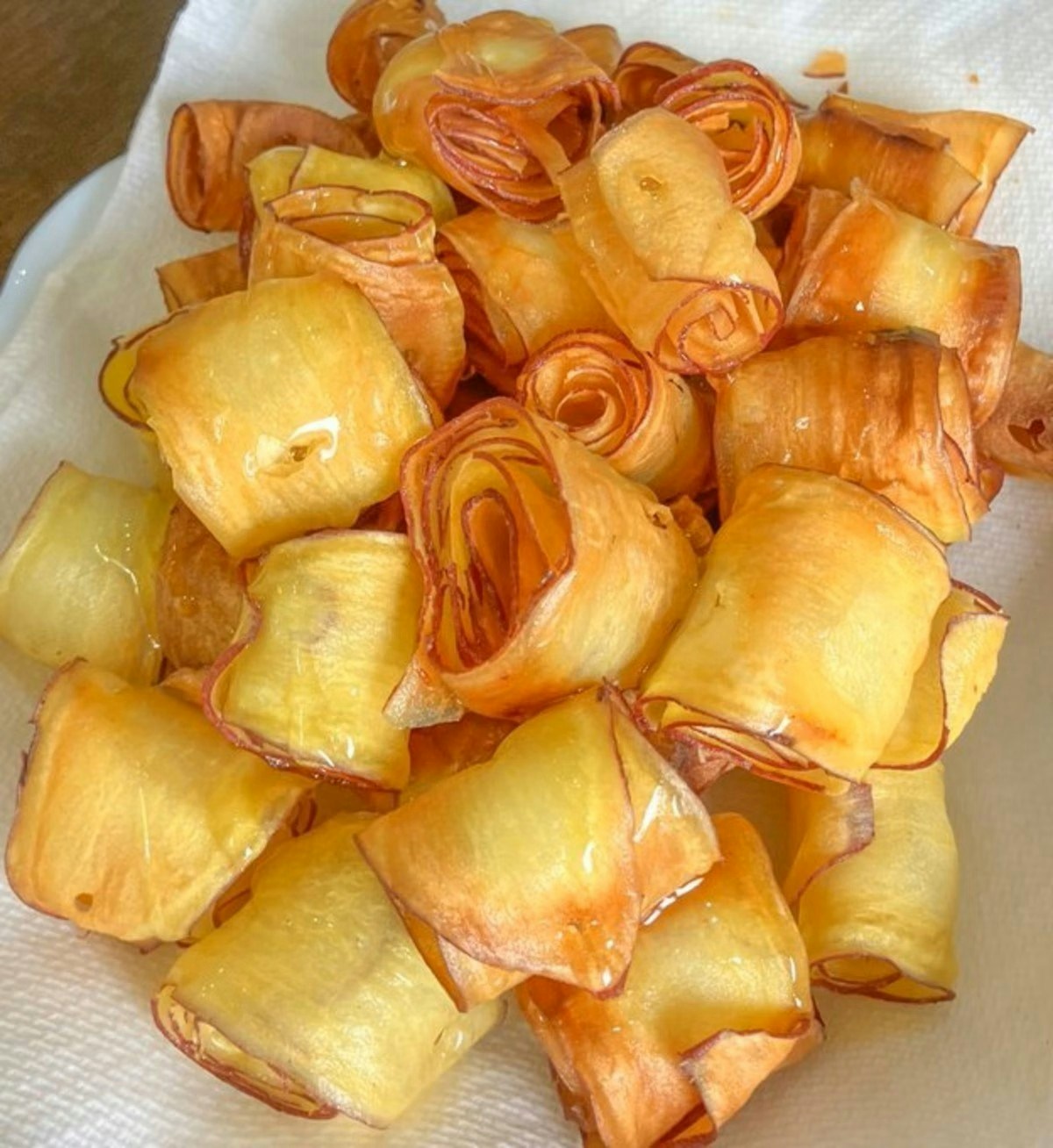 さつまいもをスライサーで薄く切り、丸めて爪楊枝で固定。180℃の油でこんがり黄金色になるまで揚げ、ハチミツをかけると、カリッと美味しく仕上がります ※3