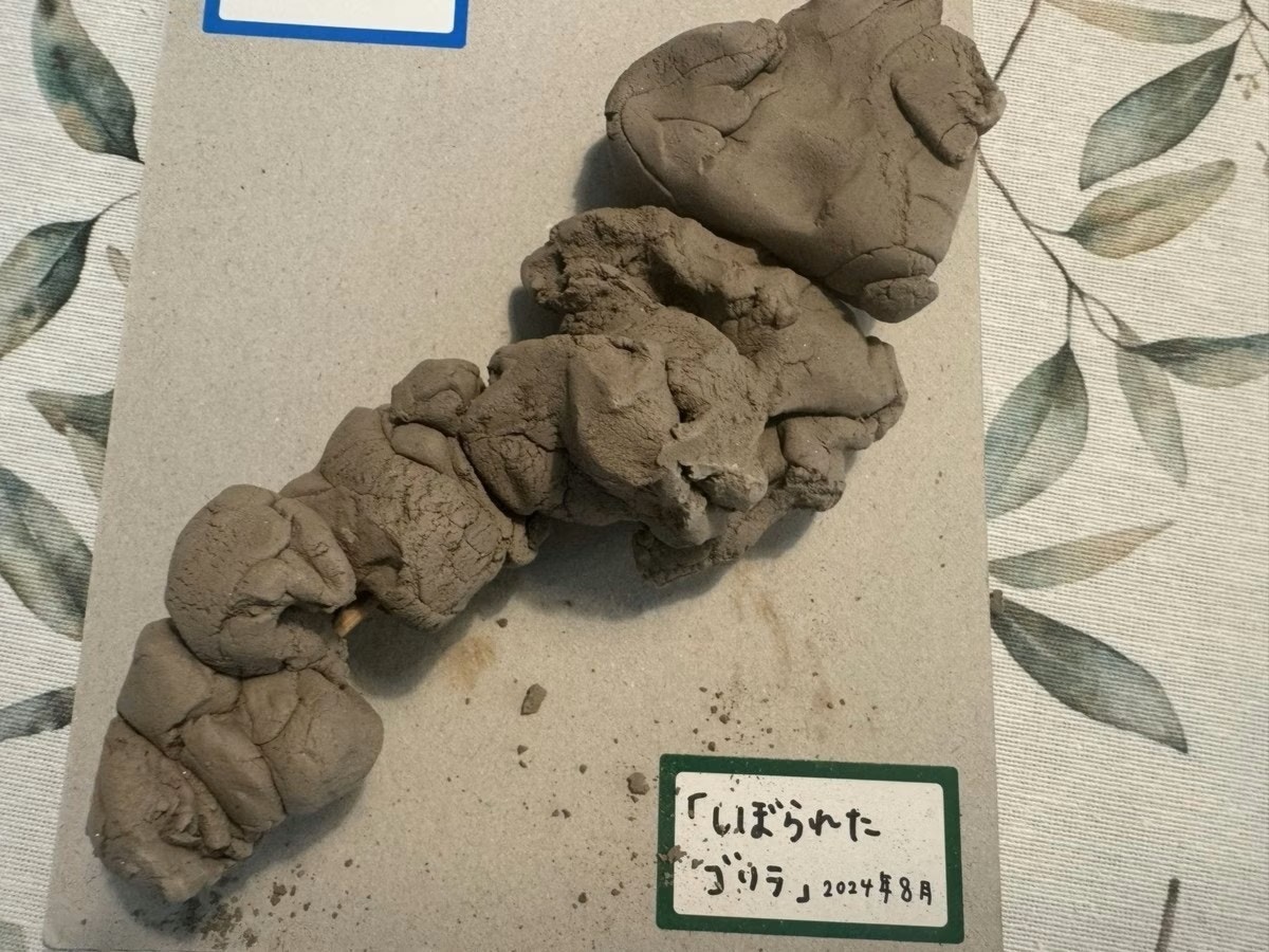 「しぼられたゴリラ」とタイトルがつけられた粘土作品。タイトルから考えると「ゴリラを作って絞ったのか?」と想像できますが、なぜゴリラが絞られたのかが気になるところ。ストーリーに想像がふくらみます。これほど想像の余地がある奥深い作品を、5歳児が作ったということにびっくりです。