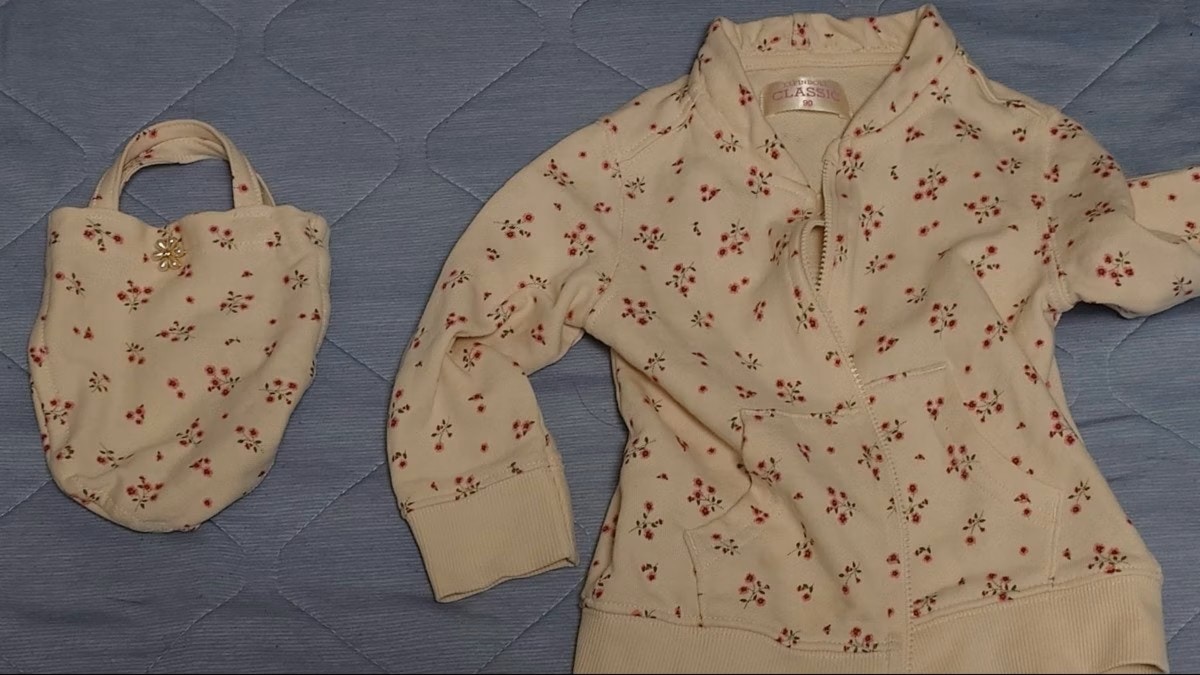 フード部分を切るだけでなく、フードを娘さん用の小さなかばんに!服とおそろいなのでお出かけが楽しみになりそうですね。さらに、かばんに付けられたワンポイントは、壊れていた娘さんのお気に入りの髪留めだそう。こうして大事に保管されていて、別の形で使うのは素敵なアイデアですね。