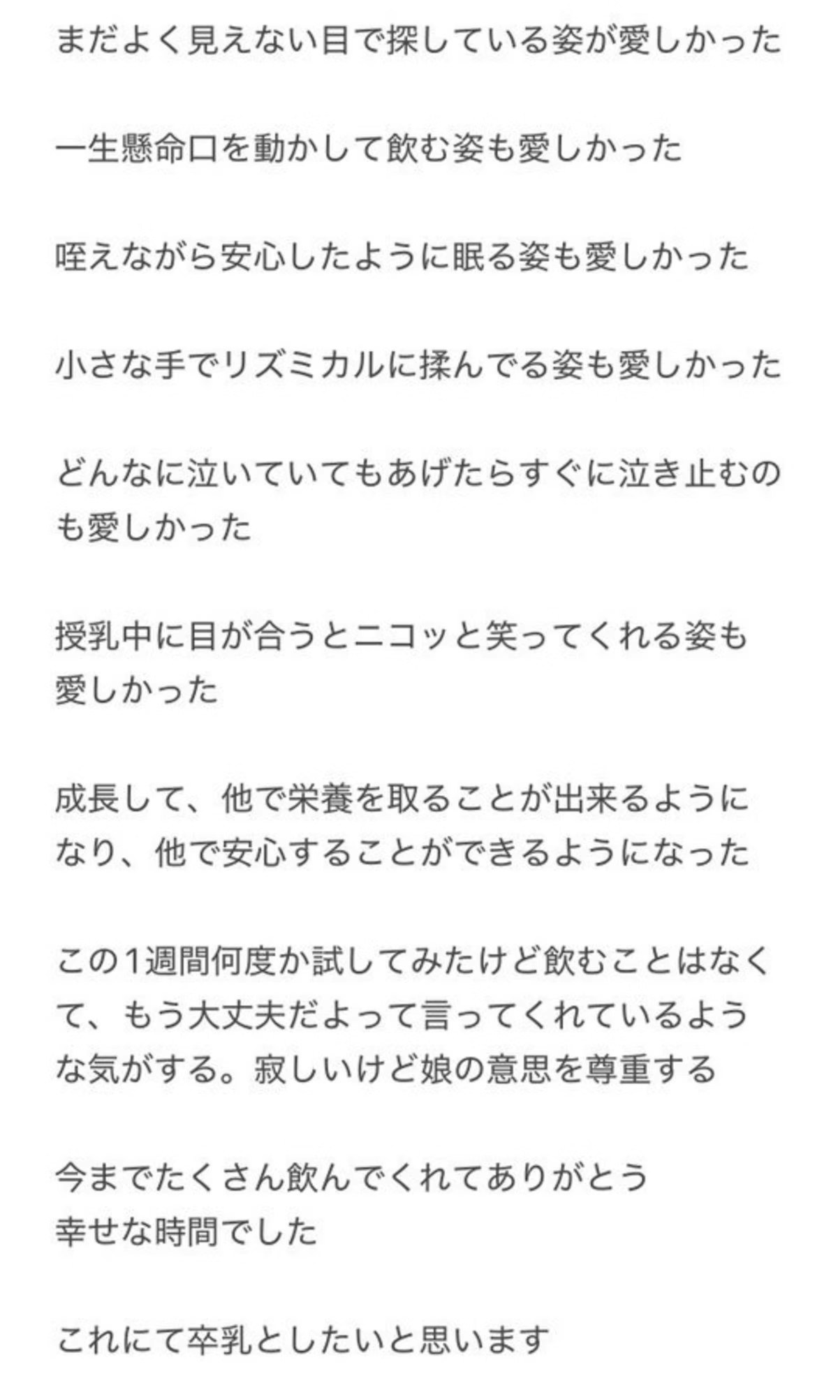 この投稿には「お疲れ様でした。泣きました」「まだ授乳中の子をもつ夫ですが、涙が出てきました。これまで授乳、本当にお疲れ様でした。」といったリプライがついていました。ほっこりとした気持ちになる投稿でした。