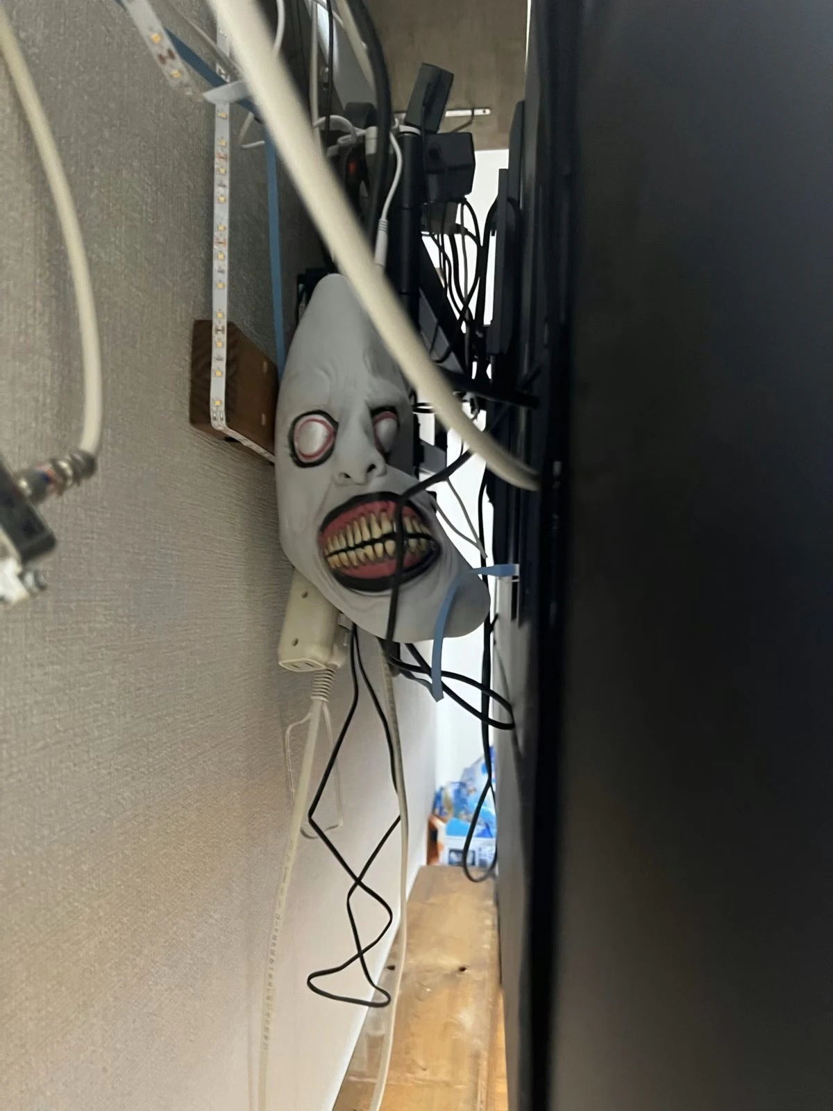 息子さんの視線の先を追っていくと…思わず大人もビクッとしてしまう恐怖の仮面がありました。狭くて暗くて、ふと目を向けると“いる”というのが、余計に怖いかもしれません。インパクトがあり過ぎますが、安全には変えられないですね。