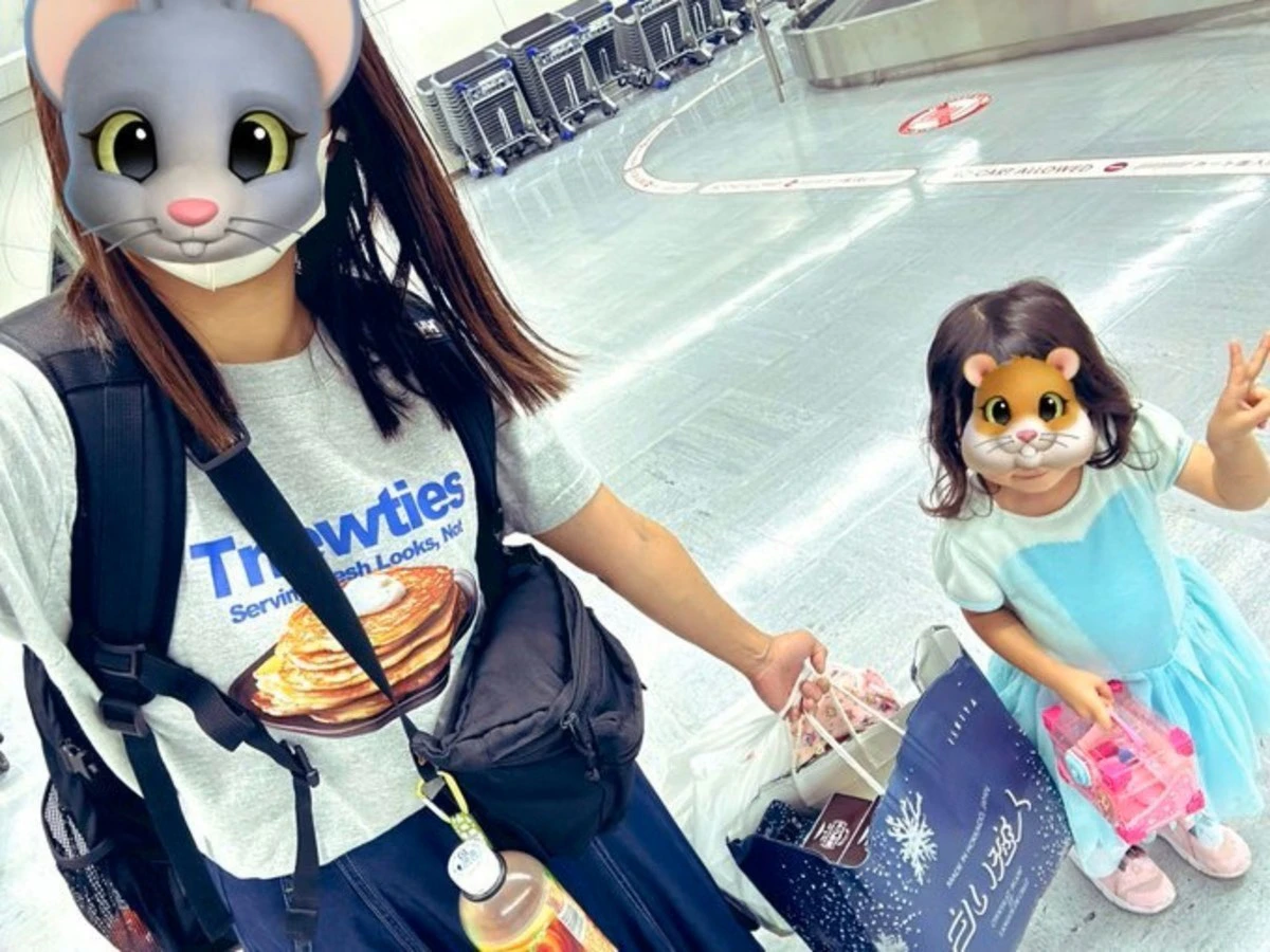 この写真だけでもくるるさんの苦労が伝わってくるようです…。ぱんぱんに詰まったカバンやお土産、さらにはカラビナでぶら下げられた飲料ボトル。移動で疲れ切った体にこれだけの荷物は本当に大変です。さらに娘さんから目が離せないとなると、親の偉大さを感じさせられます。