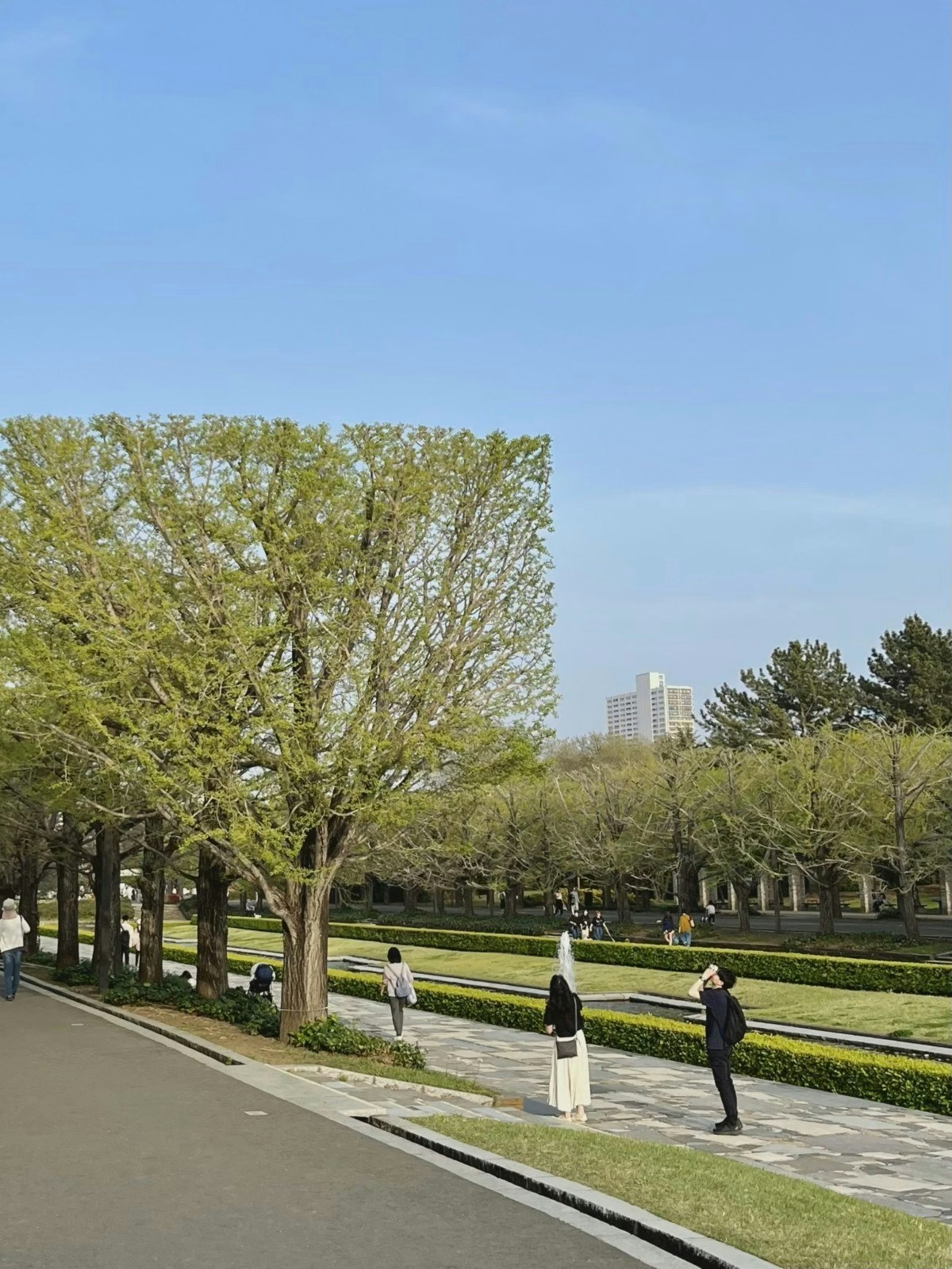 「よく「どうしてカナールのイチョウ並木は四角く刈り込んでいるのか?」という質問をいただきます。 それは公園に隣接する自衛隊の滑走路の航空制限が8mに規定されていて、木の高さを7mにする必要があるためです。 樹高を7mに合わせてぶつ切りにするだけでは、せっかくのカナールの景色が台無しになってしまいます。そこで、並木の両サイド、一番手前と奥の面をきれいに刈り込み、ボックス状に整形することで、カナールの直線美と融合した昭和記念公園ならではの景色を作り上げています。」 ※4