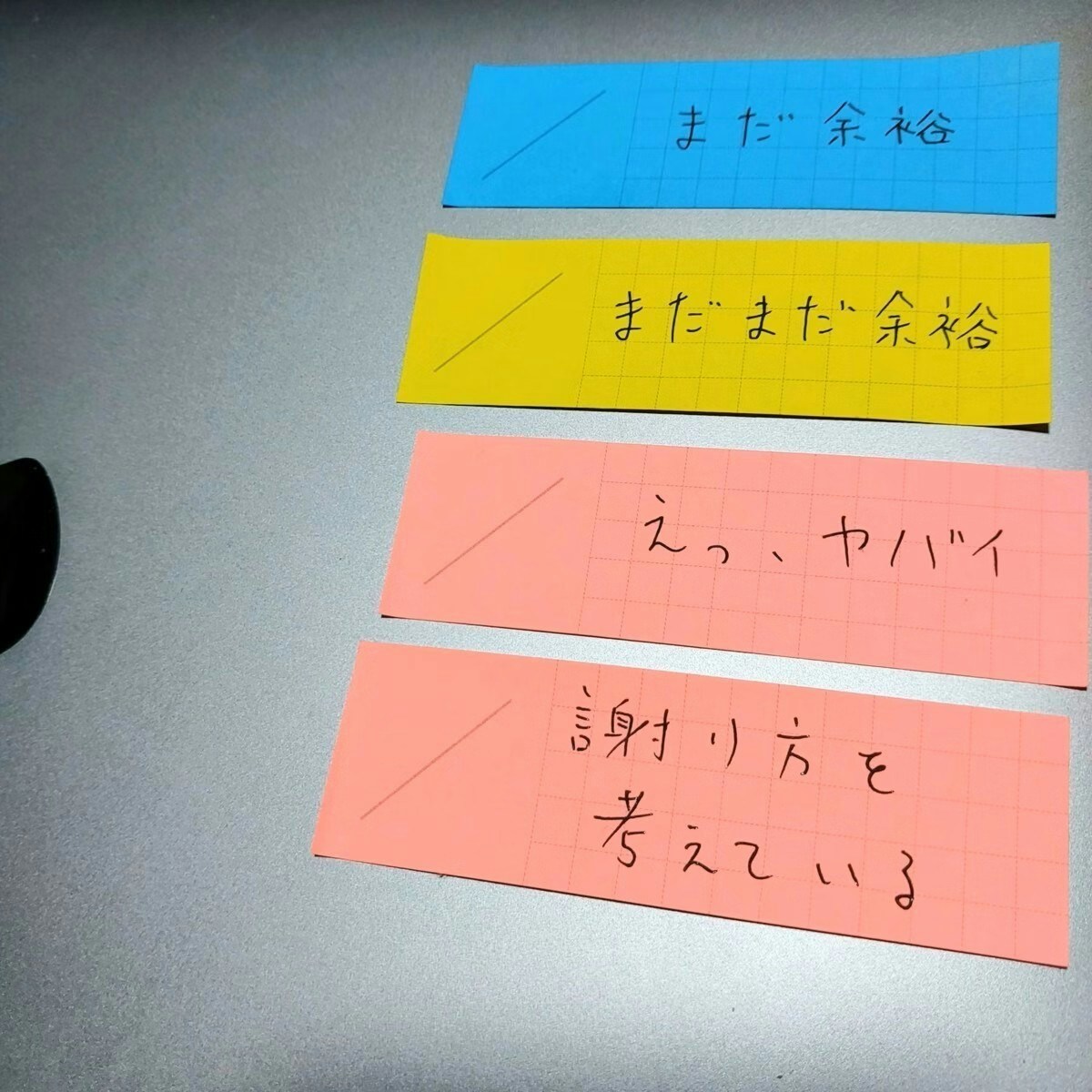 青・黄色・赤で色分けされた付箋にはそれぞれ「余裕」「まだまだ余裕」など心の声が書かれています。黄色から赤へと変わった途端、危機感が一気に上がるのがリアルですよね。タスクが多すぎて管理しきれない、あるいは手が回らない状態なのでしょうか。わかりみが深すぎる付箋です。