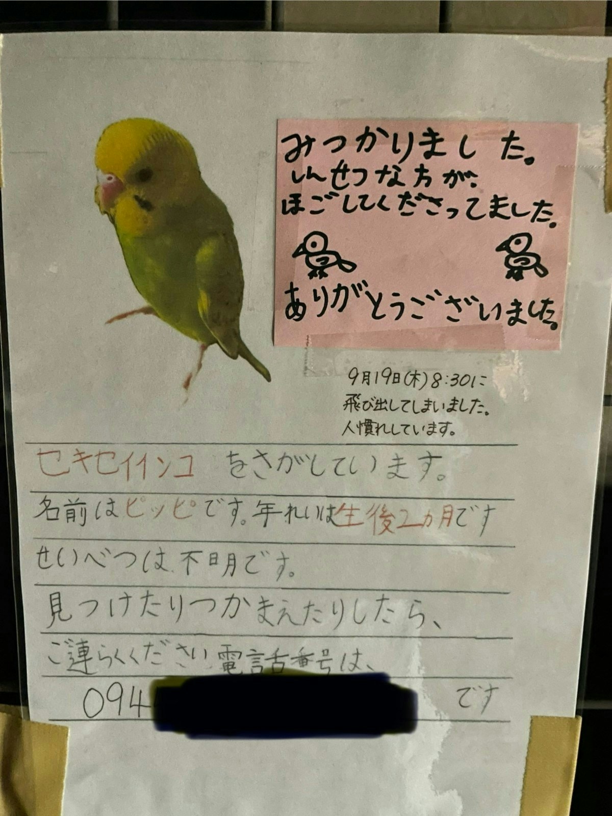 セキセイインコが見つかったのは、息子の作った貼り紙のおかげでした。これを親切な方が写真に撮って下さってて、保護した方に見せて下さったんです。