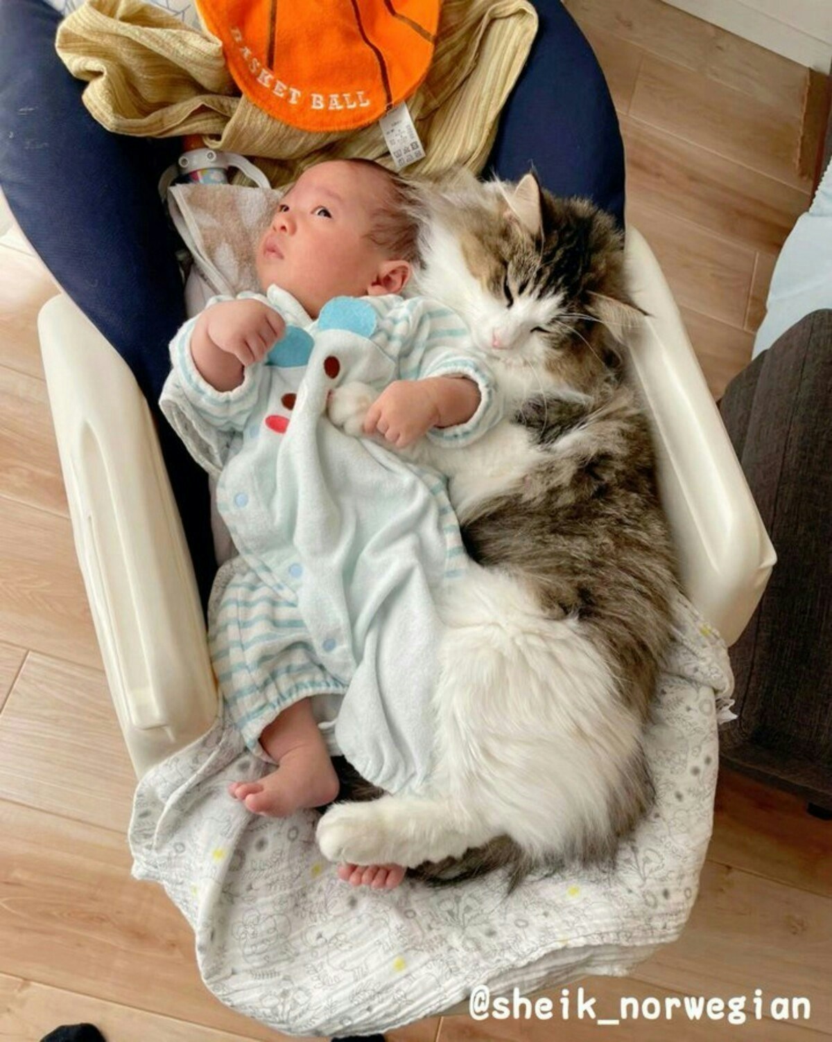 ふわふわな毛並みと大きな体が特徴的なシィクくん。息子さんがまだ赤ちゃんの時は息子さんよりも大きいように見えます。ハイローチェアに一緒にゴロンとする様子はまるで兄弟かのようです。満足げなシィクくんと対照的に、息子さんはちょっと驚いているような表情をしているのがたまらないですね。
