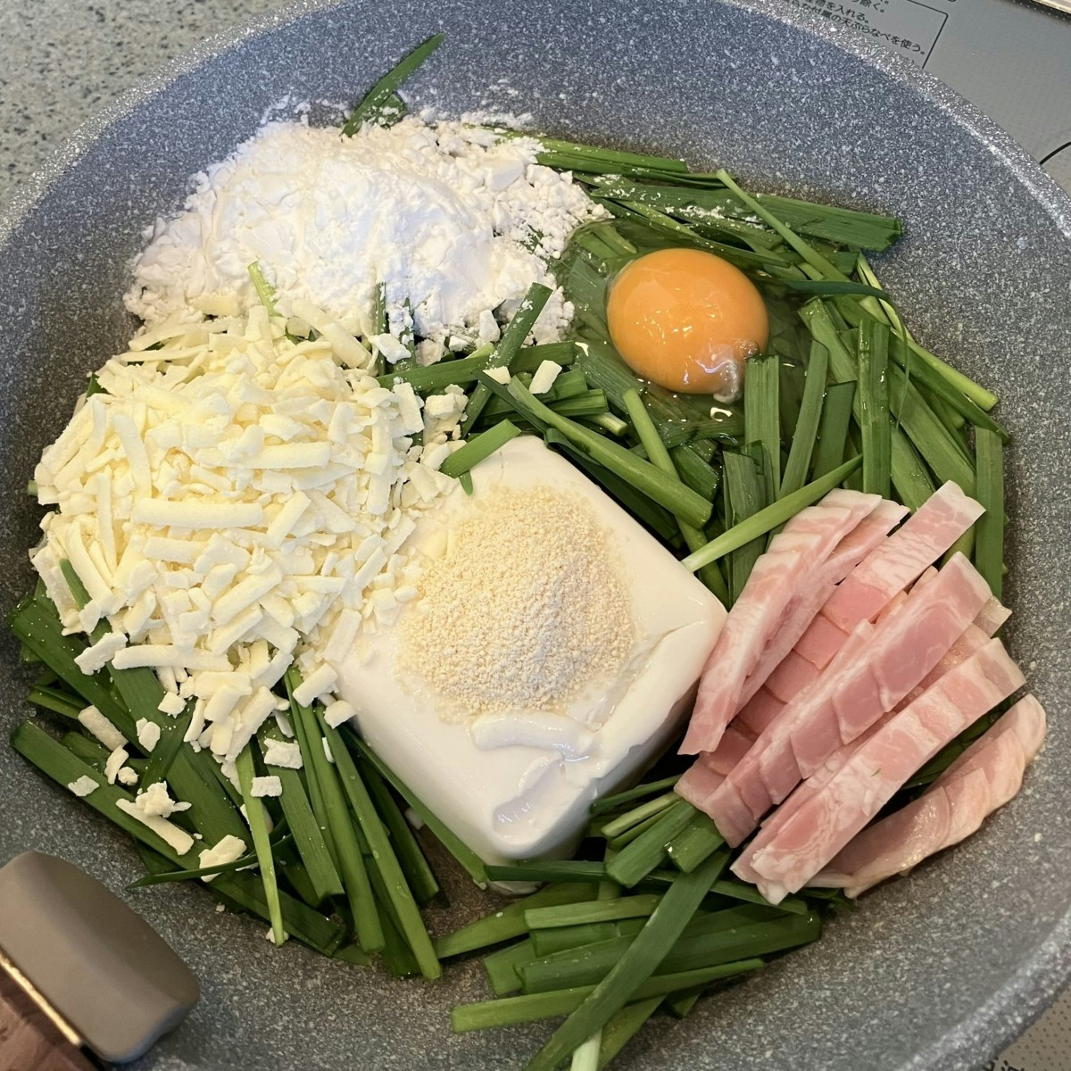 ニラ豆腐のチーズチヂミ。フライパンにざく切りニラ1束、豆腐、卵1個、細切りベーコン・ピザ用チーズ各50g、片栗粉大3、鶏ガラ小2を入れ、よく混ぜる。ごま油を端から足して中火〜弱火で蓋をし、両面各6分焼く。ポン酢で食べると美味しいです