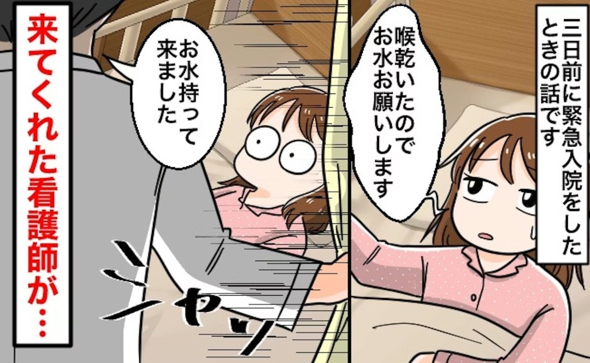 夜に救急車を呼んで入院になってその日の夜中に目が覚めて喉が渇いたので看護師さんを呼んだんですけど