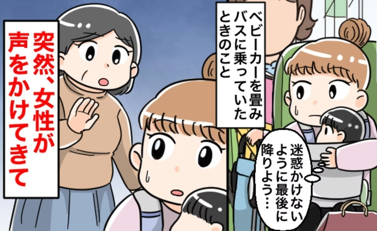 降りようと立ち上がった瞬間に、見知らぬ女性から「ベビーカー持ちますよ」と声を掛けられたMさん。誰かからこのような声を掛けられるなんて全く考えていなかったMさんはとても驚いたそうです。