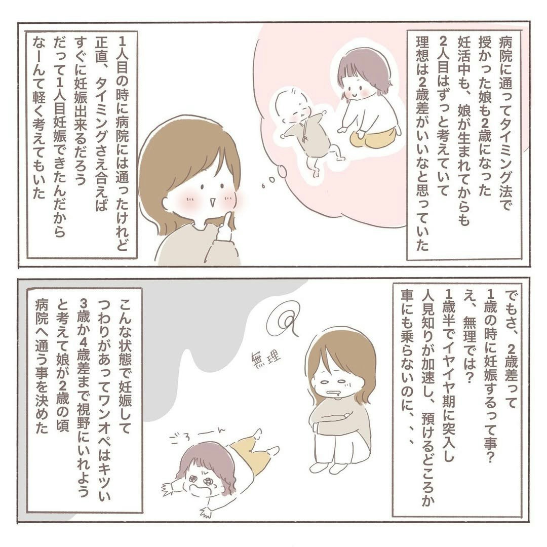 2歳差で2人目が欲しいと考えていたcoromoさんでしたが、娘のイヤイヤ期を経験し、「今の状態では難しいかもしれない」と感じるように。そこから、3〜4歳差での妊娠を視野に入れるようになりました。
