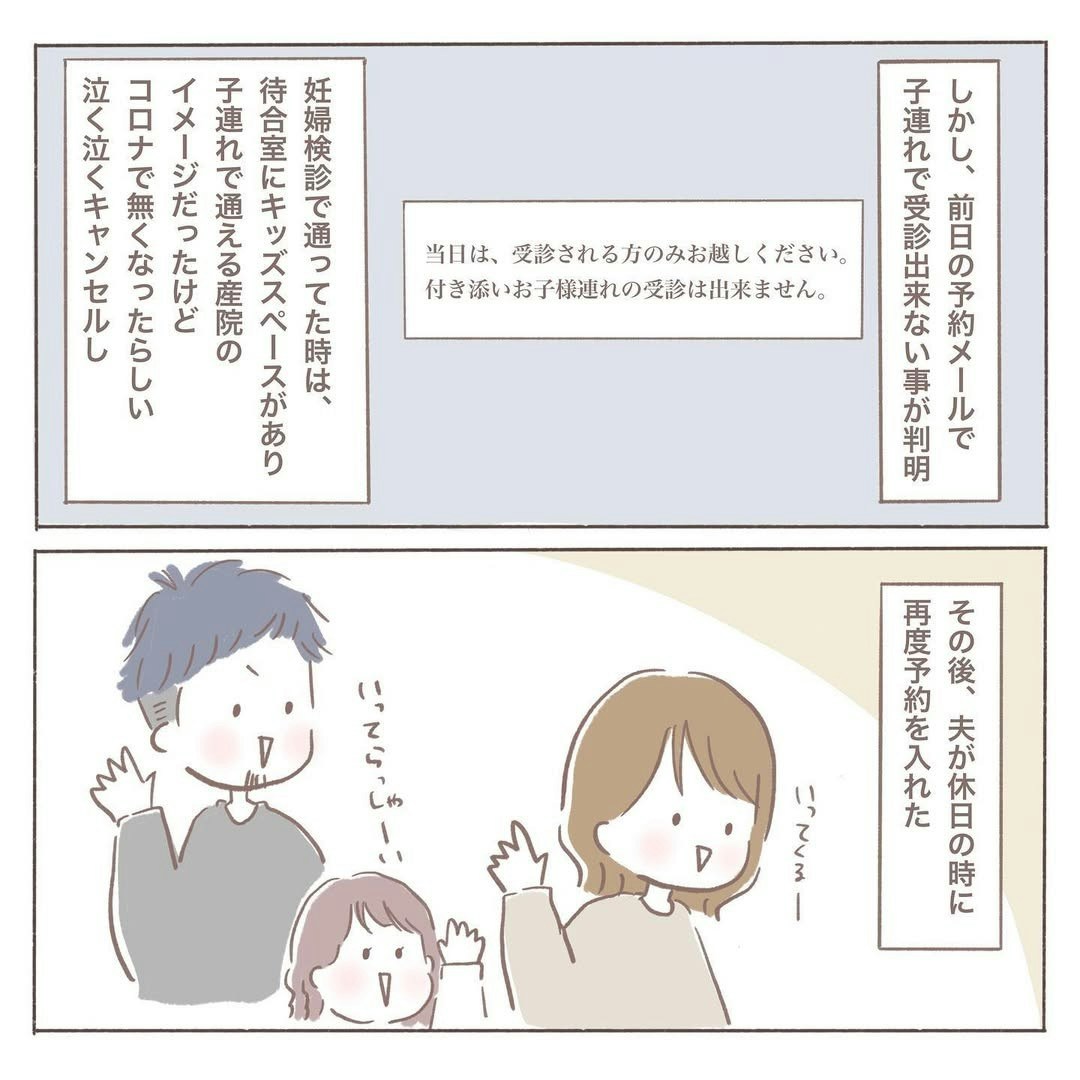 娘を出産した際にお世話になった産院へ、再び通院しようと予約を入れたcoromoさん。ところが、届いたメールにはまさかの「子連れ禁止」の文字が。やむを得ず、夫に娘を預けられる日を選び、改めて予約を取り直すことになりました。