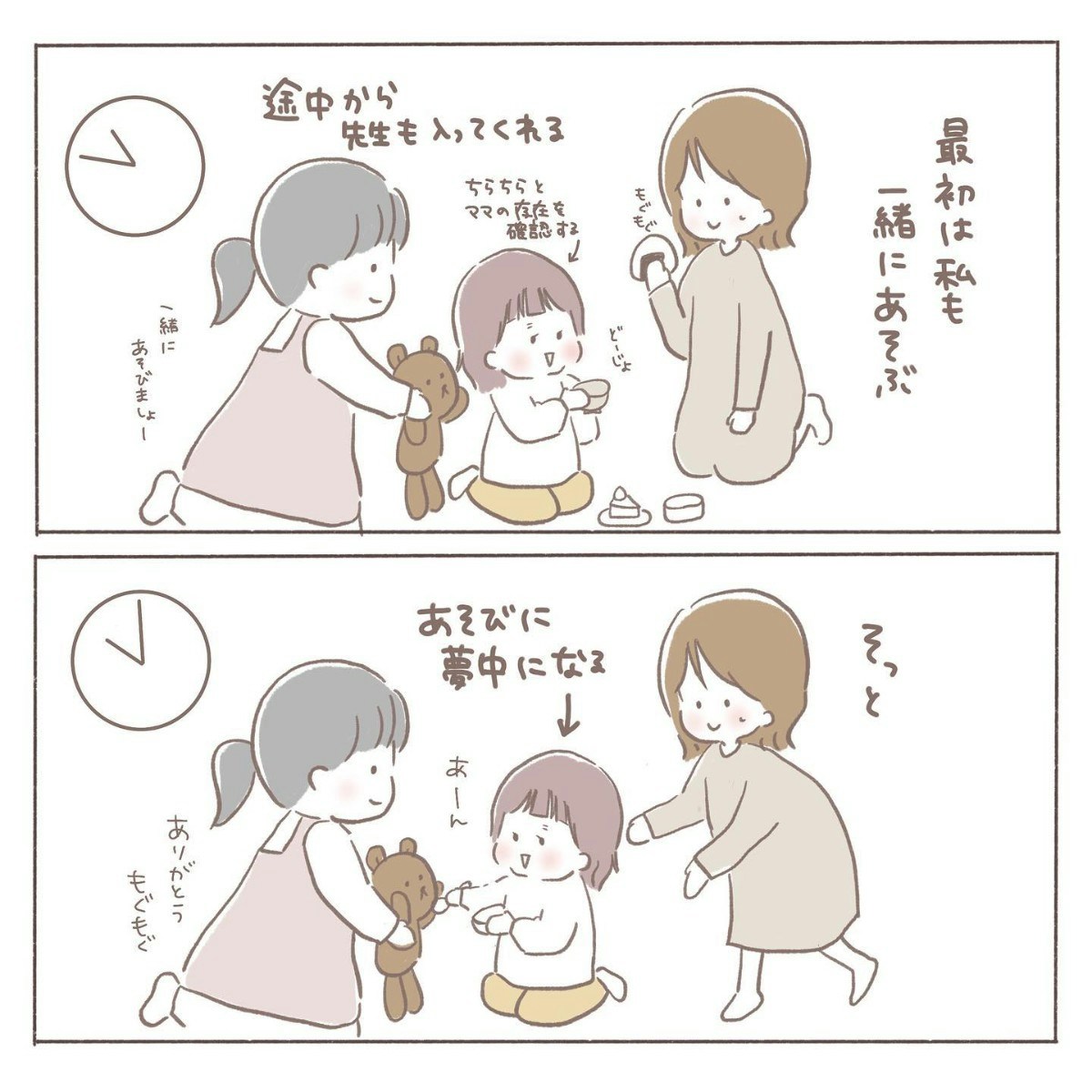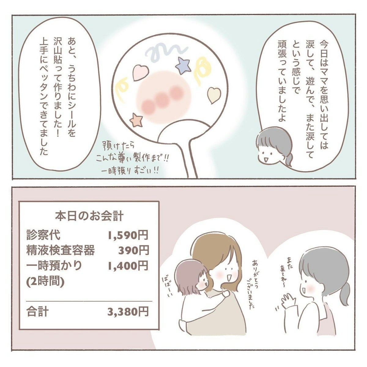 2度目の一時預かりを利用して病院へ向かったcoromoさん。診察では排卵していないと言われ、原因も特定できないとのことでした。お迎えに行くと、娘さんは涙を浮かべていたものの、先生と一緒にかわいい作品を作っていたようで、また一歩成長した姿を見ることができました。