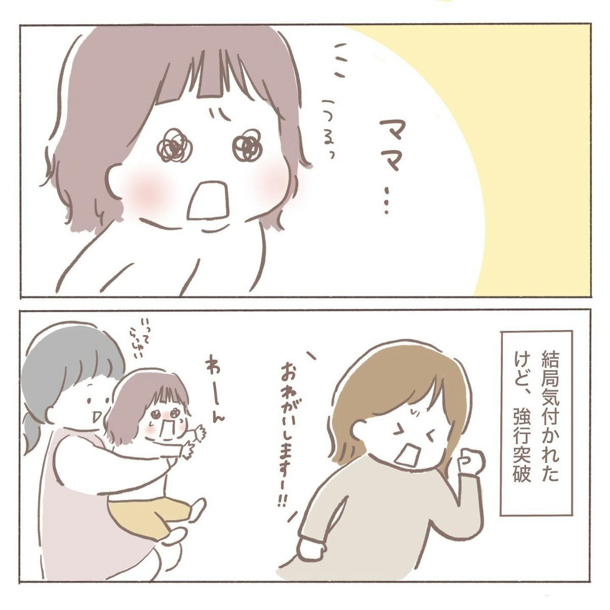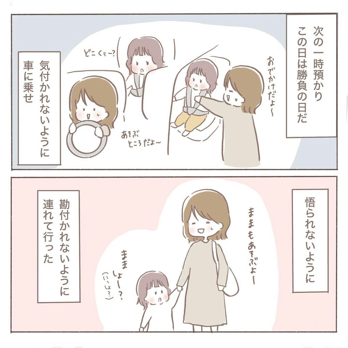 そっと抜け出す作戦で行こうとしていたcoromoさん。しかし、さすがは娘さん。ママの気配が消えたことにすぐ気づき、泣き出してしまいました。それでも病院には向かわなければならず、coromoさんは後ろ髪を引かれつつも強行突破することに。