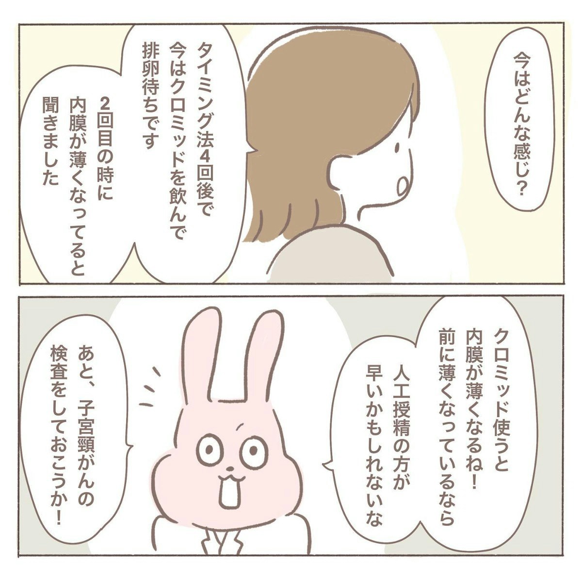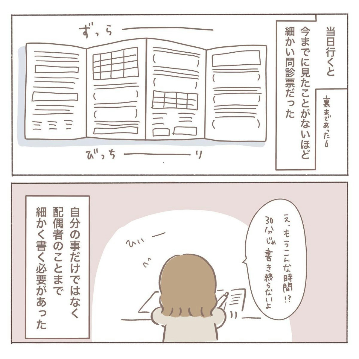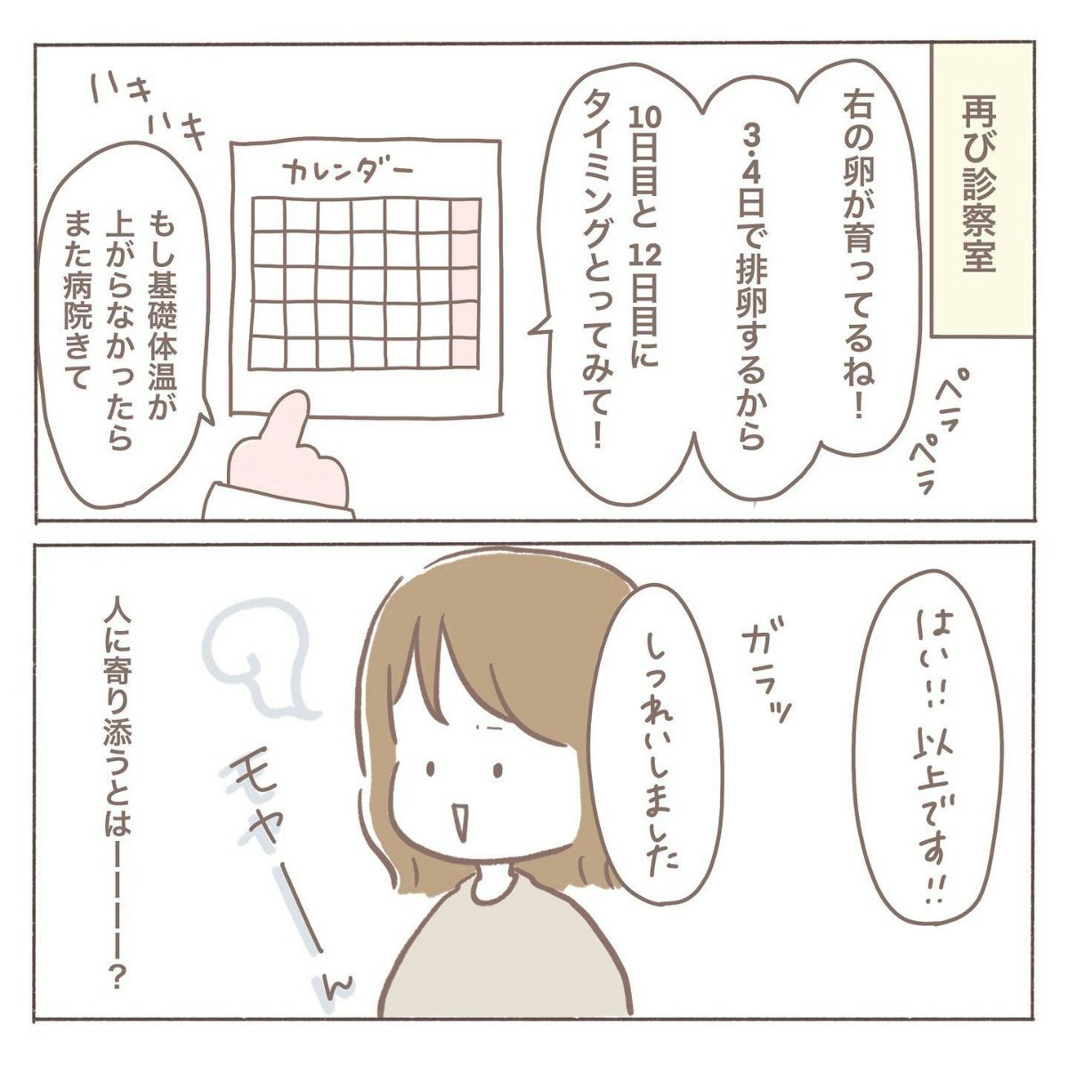 初めての不妊治療専門クリニック。詳しく問診票を書き、いよいよ診察へ――。しかし診察は淡々と進み、気づけばあっという間に終了。必要な説明はされているはずなのに、どこか「患者に寄り添う」感じがなく、機械的に処理されたような印象が残ります。その対応に、coromoさんの胸には小さなモヤっとした気持ちが広がるのでした。