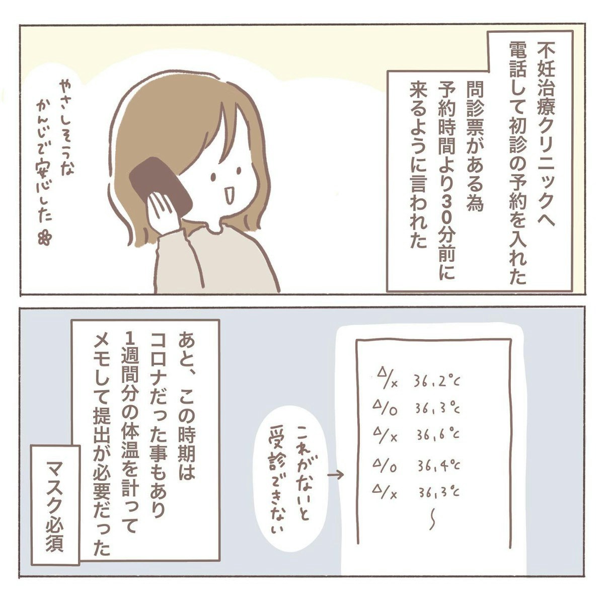 新しく通う不妊専門クリニックへ電話をかけてみると、受付の方がとても優しく対応してくれ、coromoさんはひとまず安心します。さらに、当時はコロナ禍ということもあり、体温の記録が必要との説明も受けました。