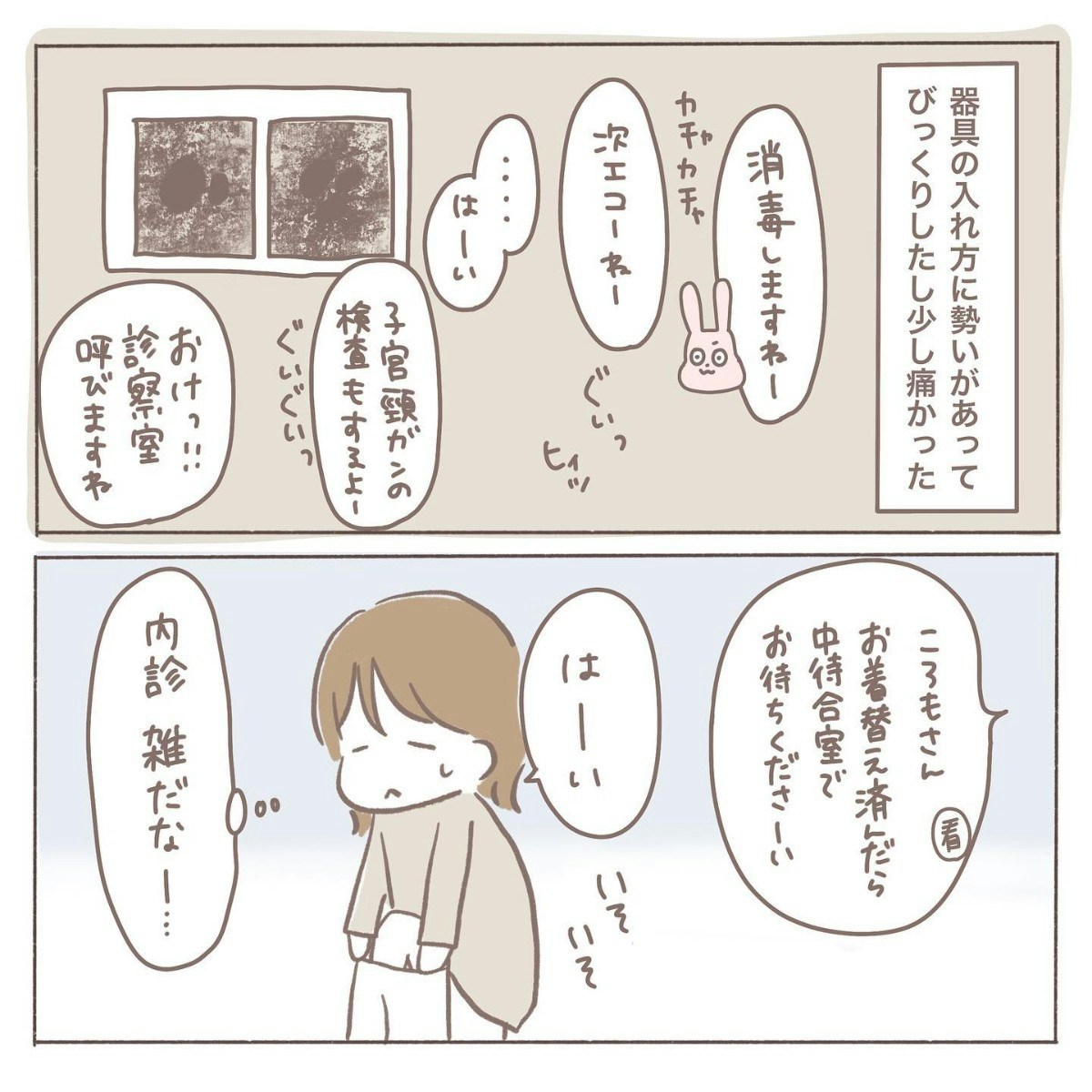 内診は雑に感じられ、痛みもあってcoromoさんは思わず身をこわばらせました。その後の診察でも先生はテキパキ進めるだけで、寄り添いはゼロ。その対応に、coromoさんの胸にはまたモヤっとした気持ちが残りました。