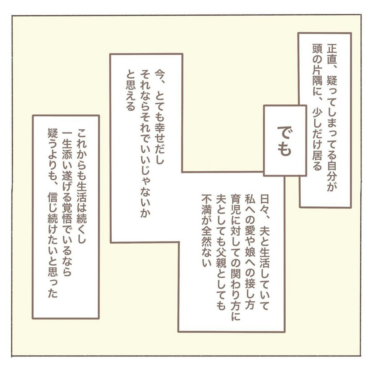 正直なところ、coromoさんは夫を疑ってしまう気持ちも抱えていました。それでも、今の幸せな生活を壊したくないという思いと、夫の家族への接し方や日頃の態度にまったく不満がないことから、今回のことは心の中にそっと蓋をしておこうと決めたようです。