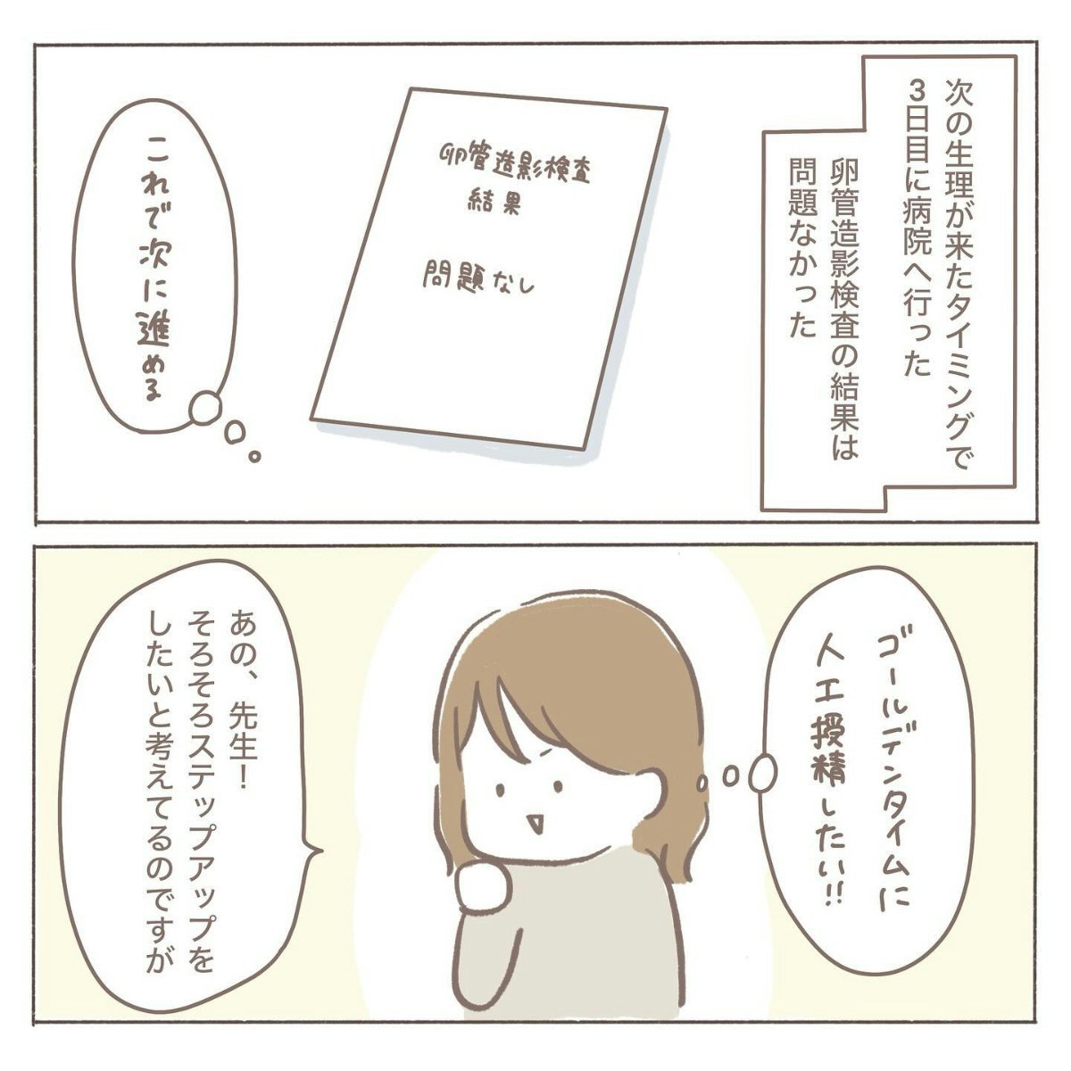 卵管造影検査の結果は問題なしとのことで、coromoさんはひとまず安心しました。そして次のステップである人工授精に進みたい気持ちを、先生に相談することにしました。