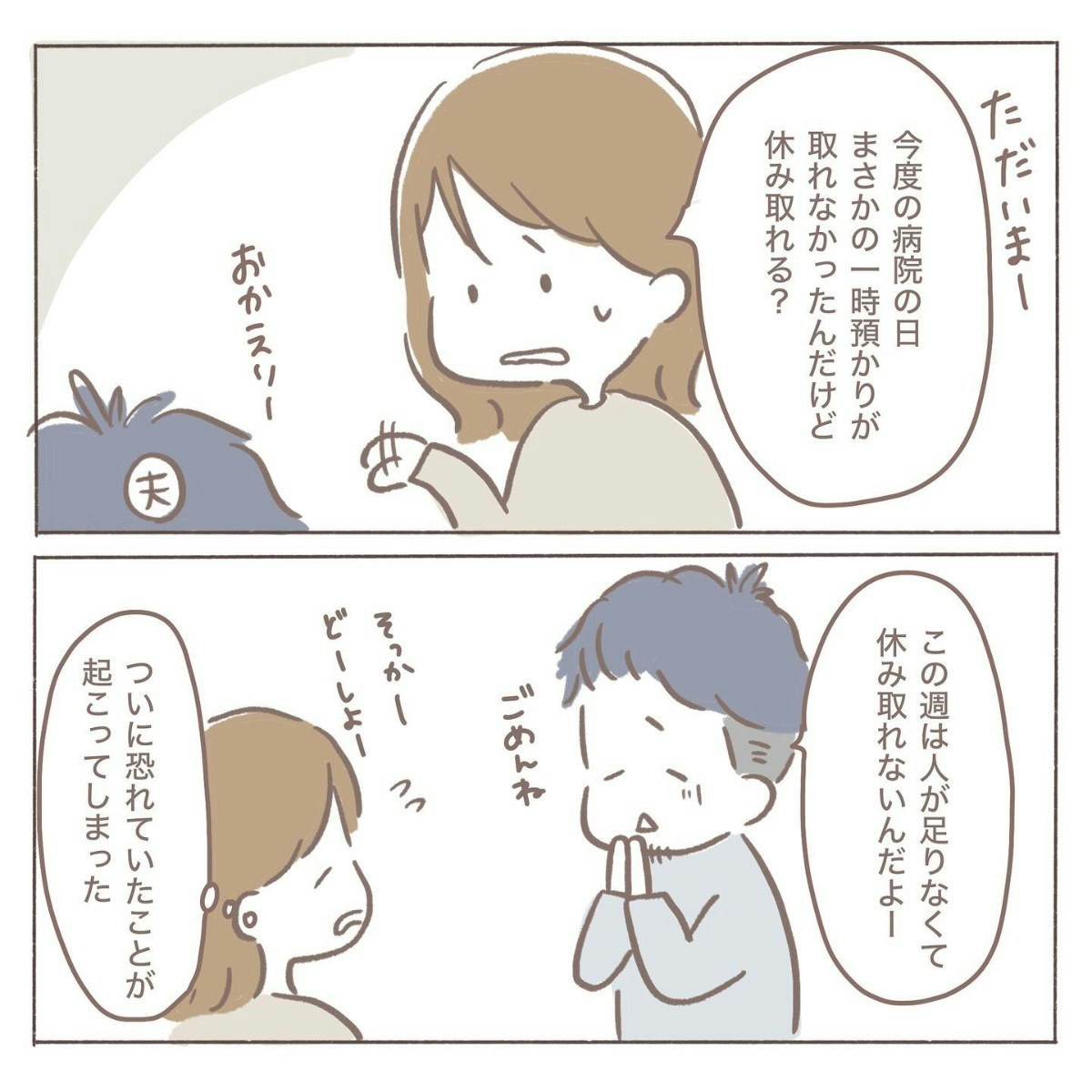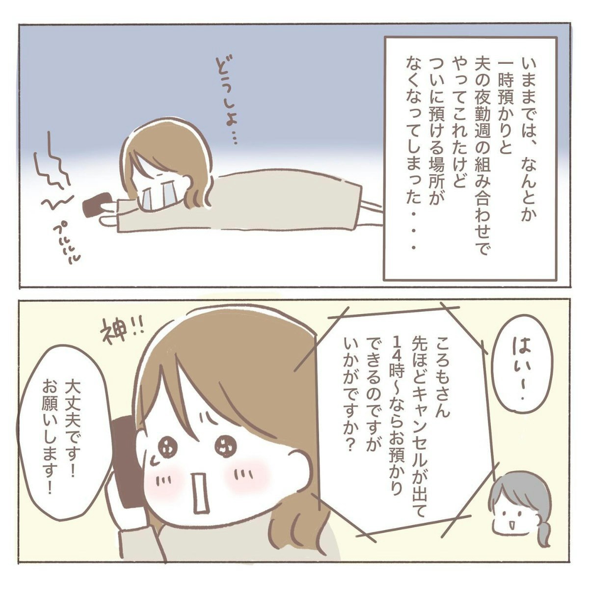 夫に休めないか相談してみたものの、ちょうど職場が人手不足の時期で休むのは難しいと言われてしまいます。ついに預け先が見つからない…と coromoさんが絶望しかけたそのとき、一時預かり先から「キャンセルが出ました」との連絡が。思わぬ朗報に、coromoさんの胸にぱっと光が差し込みました。