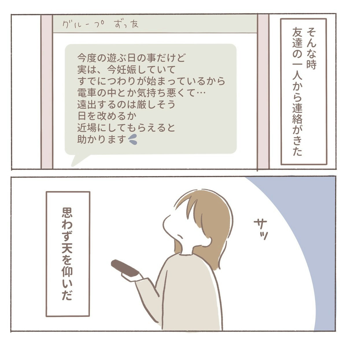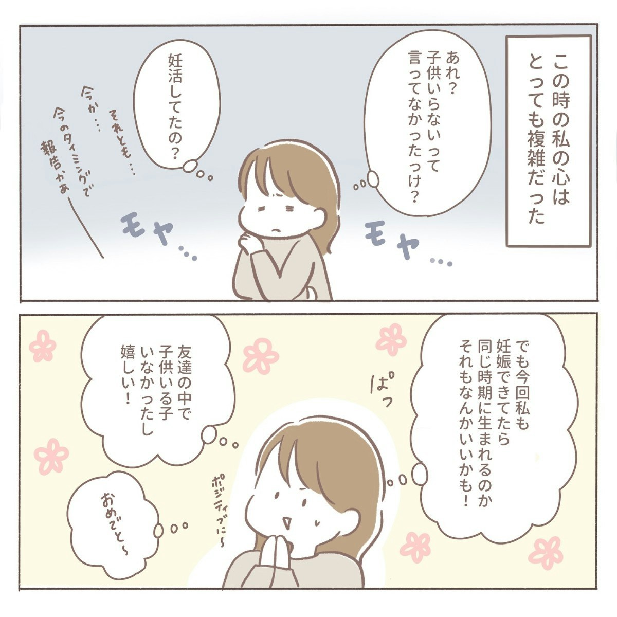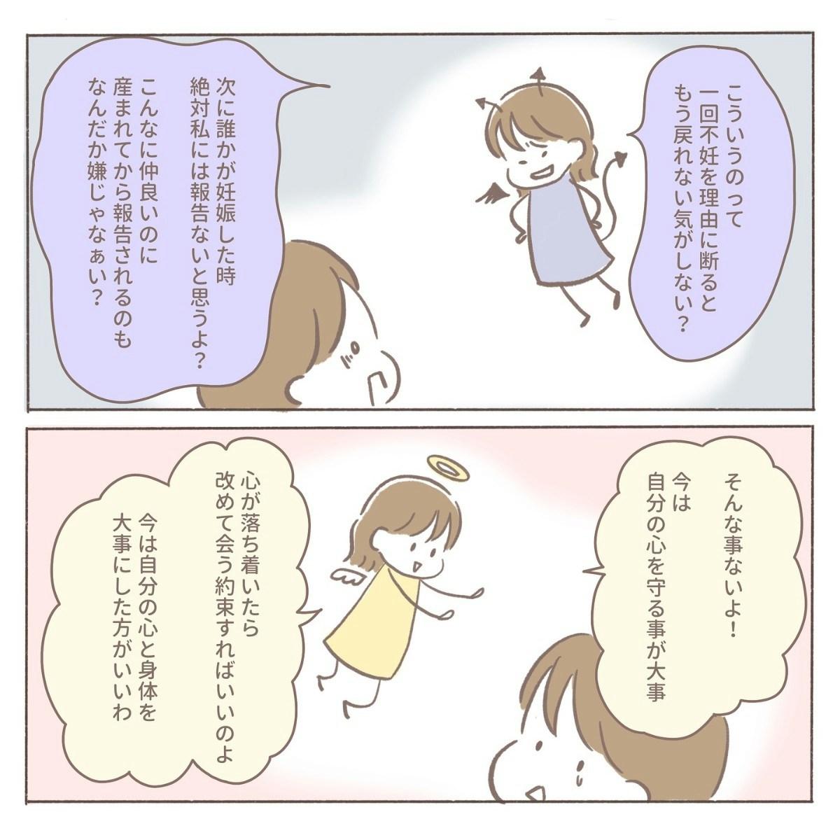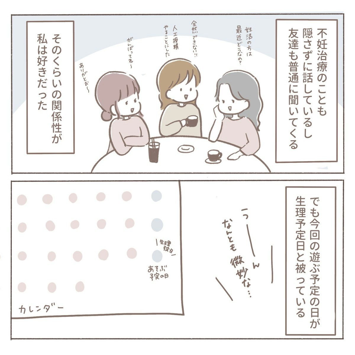 不妊で悩んできたからこそ、友人にも少しだけ気持ちを分かってほしかった。優しい言葉を期待していた自分に気づき、coromoさんは「自分のことばかり考えていたかも」と反省します。それでも、自分の心も友人との関係も大切にしたい──そんな思いが入り混じり、胸は複雑に揺れていました。