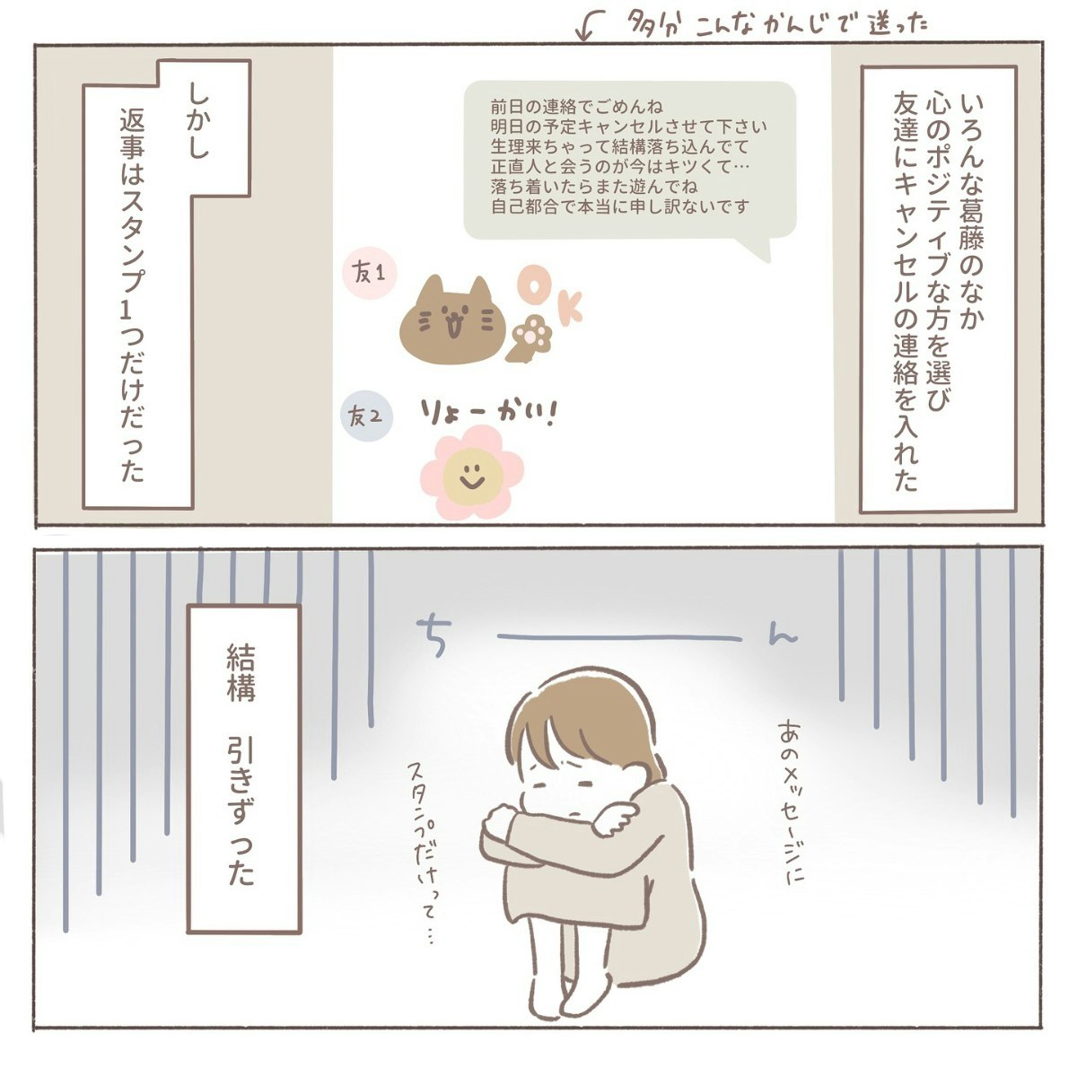coromoさんの心の中では、天使と悪魔が静かにせめぎ合っていました。それでも最後は、「自分の気持ちを大切にしよう」と勇気を出して友人にメッセージを送りました。ところが返ってきたのは──まさかのスタンプ1個だけ。その軽さに、胸の奥がひゅっと冷えるような感覚が広がっていくのでした。