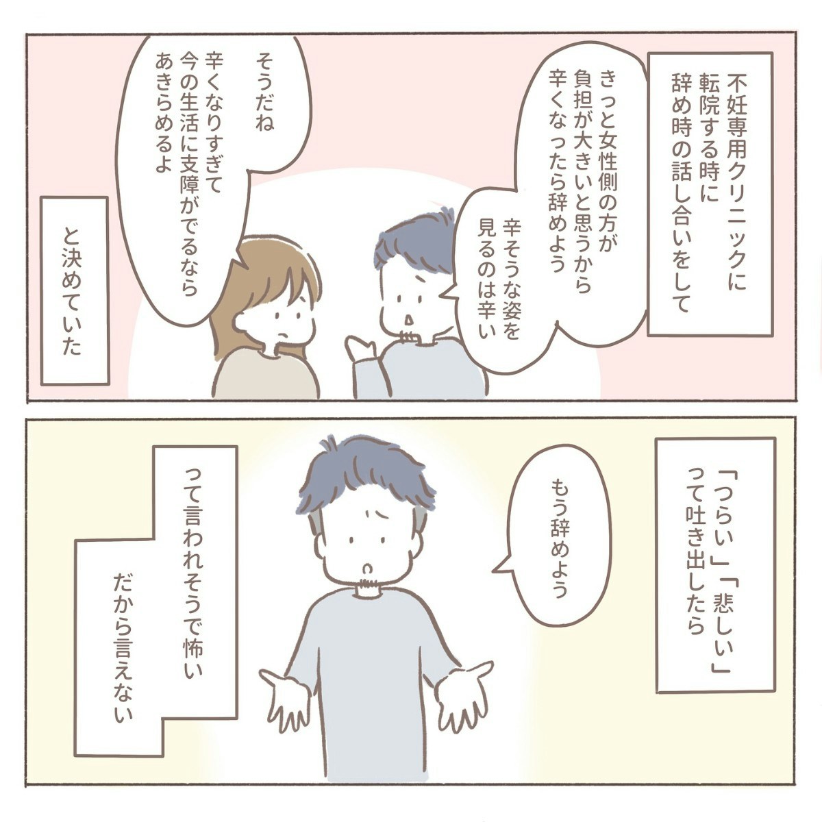 クリニックを変えるとき、夫と「つらくなったらやめよう」と約束していました。でも、まだ諦めたくない気持ちがあるからこそ、つらさを口にした瞬間に「やめよう」と言われてしまいそうで怖い。その思いが、不妊治療の話を切り出しづらくさせているのです。