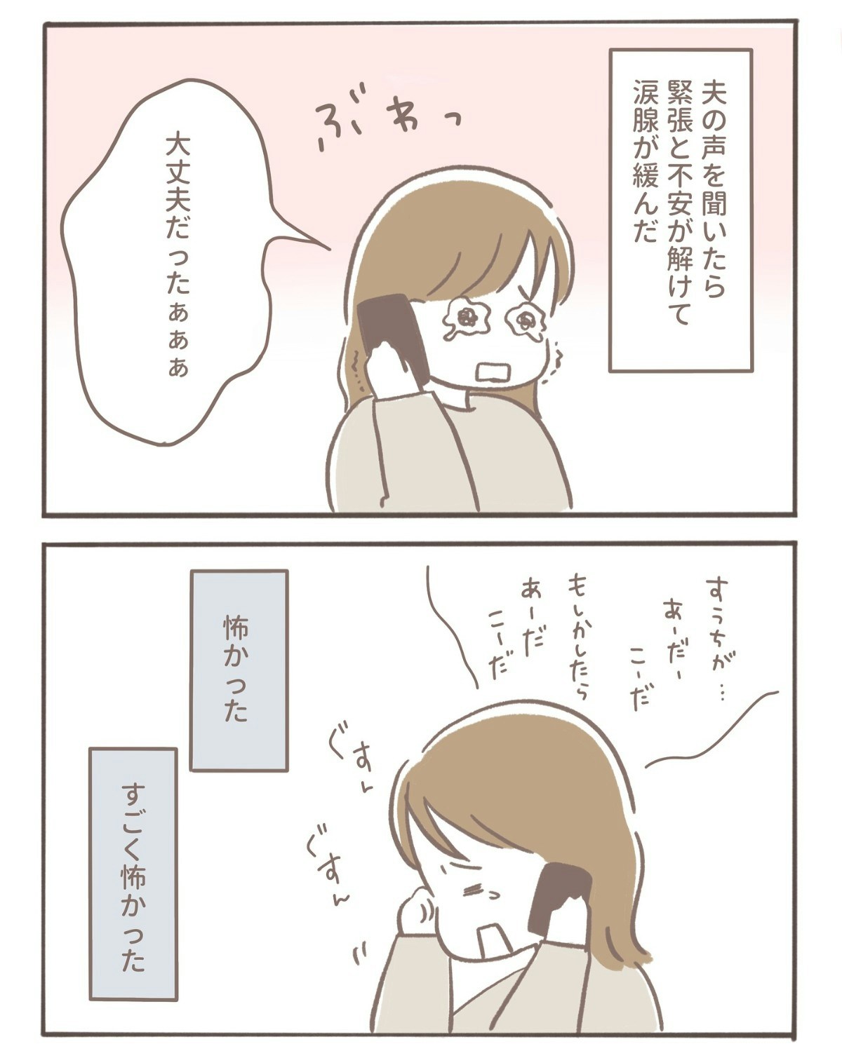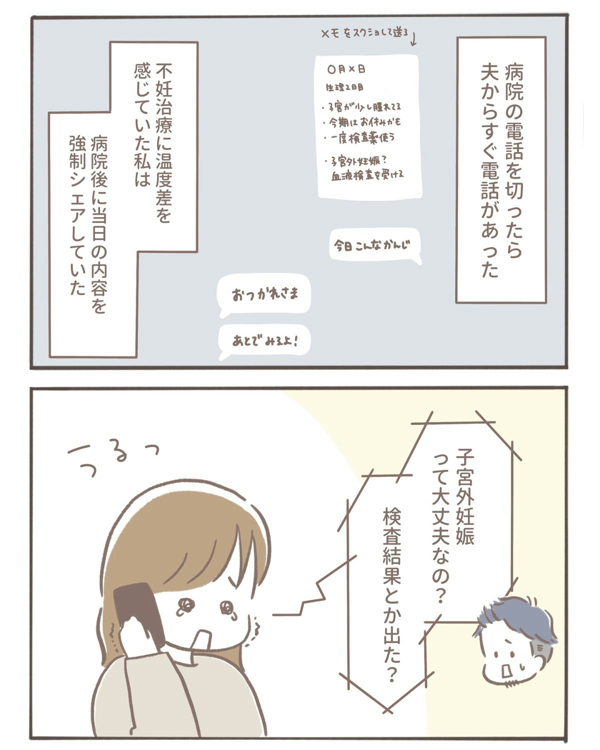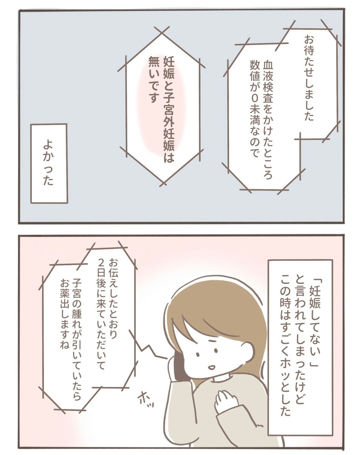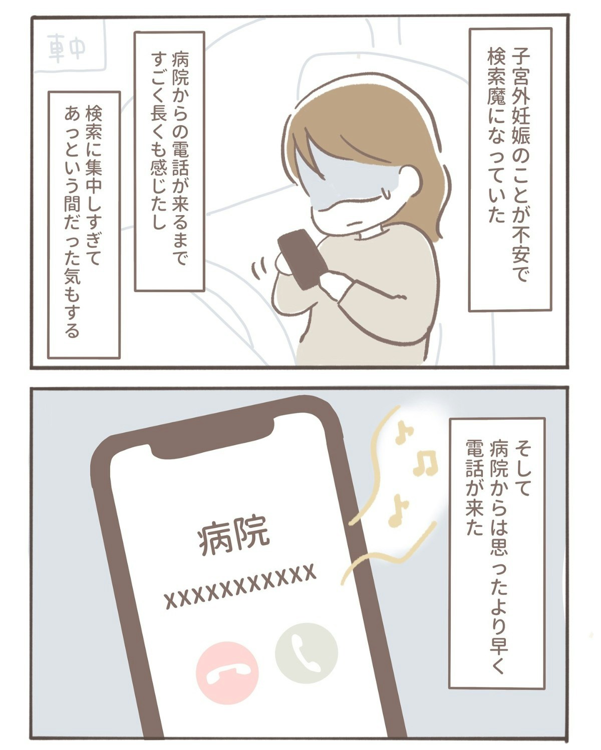 病院から電話がかかってきて、「子宮外妊娠の可能性はありません」と告げられました。その言葉に、coromoさんは胸の奥からふっと力が抜けるような安堵を覚えます。ほっと息をついたその直後、心配していた夫からも電話が。