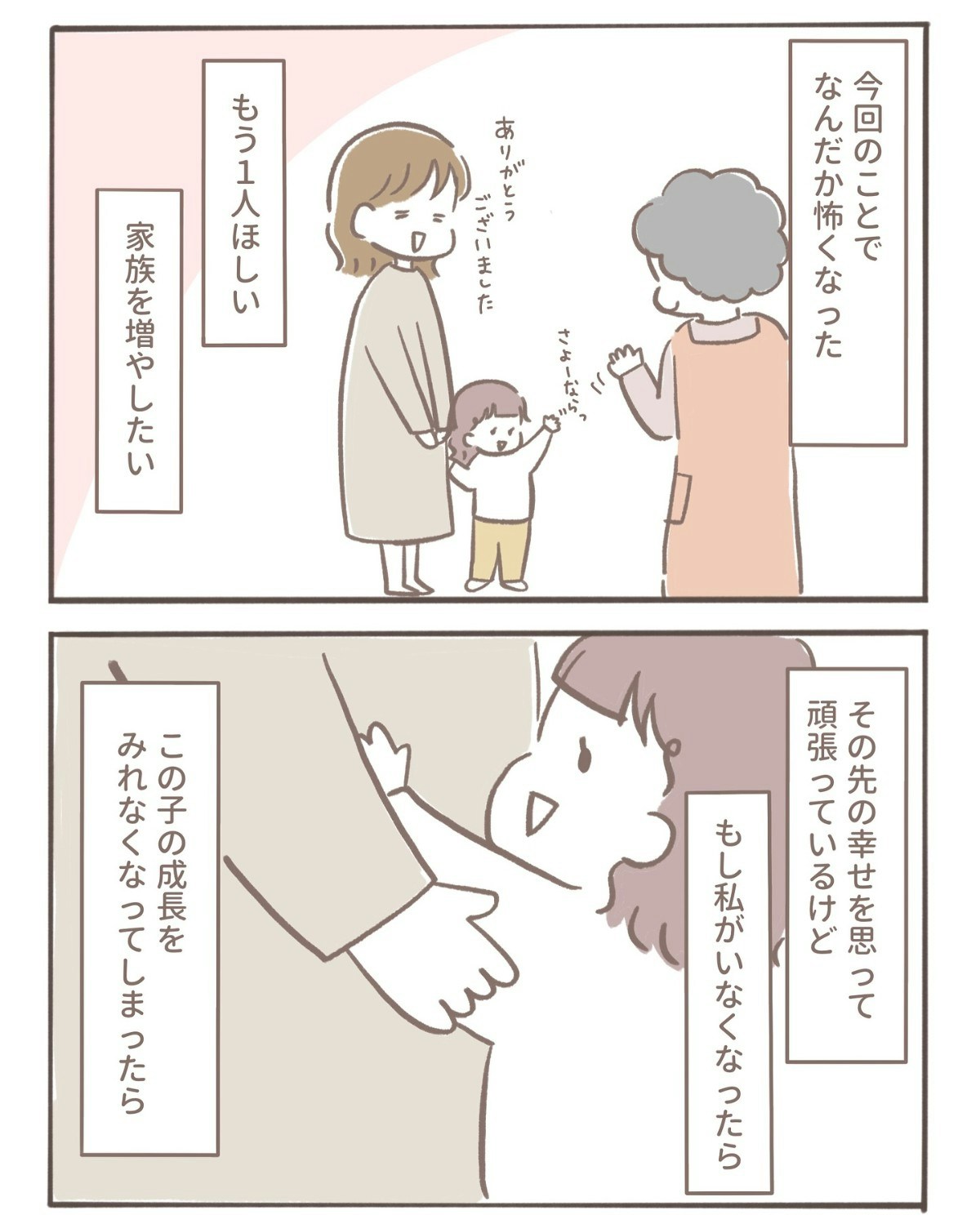 今回、子宮外妊娠について調べる中で、「死のリスクがある」という事実を知った coromo さん。もう一人欲しいという気持ちは確かにあるものの、今そばにいる娘の成長や、一緒に過ごす時間の尊さを思うと、胸の奥に迷いが生まれます。今回の出来事をきっかけに、二人目についても、これまで以上にじっくりと考えるようになったのでした。