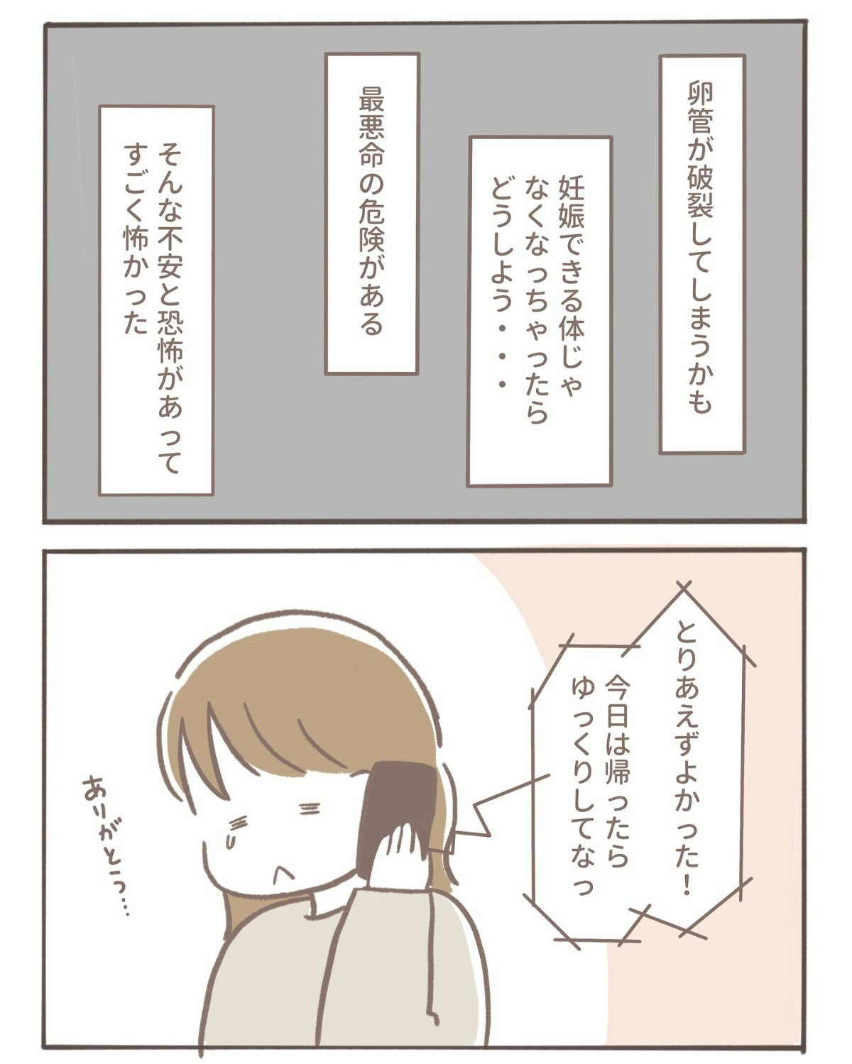 まったく知識のなかった「子宮外妊娠」の内容。不安を抑えきれずに調べてみるものの、出てくるのは怖い情報ばかりで、読むほどに心がざわついていきます。知らないことがこんなにも不安をあおるのかと、胸がぎゅっと締めつけられる思いでした。