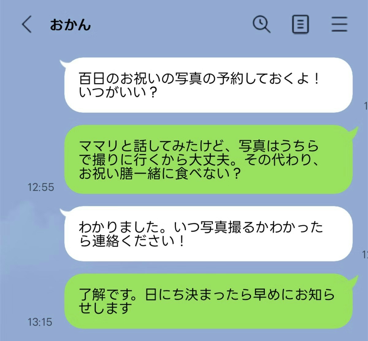 今回3人目が産まれ、百日の写真予約しておくから日にちはいつがいい?と旦那の携帯にLINEがきてました。