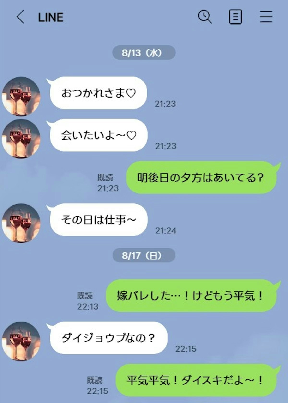 「嫁にバレちゃった」「疑われるから今日はもう寝るね♡」と…「大好きだよ〜♡」と…。