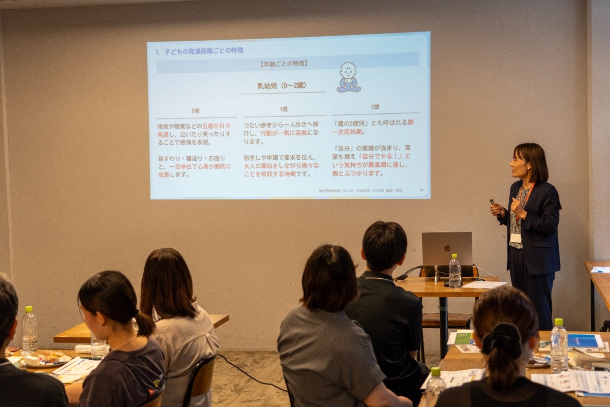 講師は、0〜2歳、3〜5歳、6〜8歳の区切りで、年齢ごとの発達について説明。乳幼児には「安心できる存在でいること」、未就学児には「一緒に楽しむ姿勢を大切にすること」など、関わり方のポイントを大学生に伝える時間となりました。