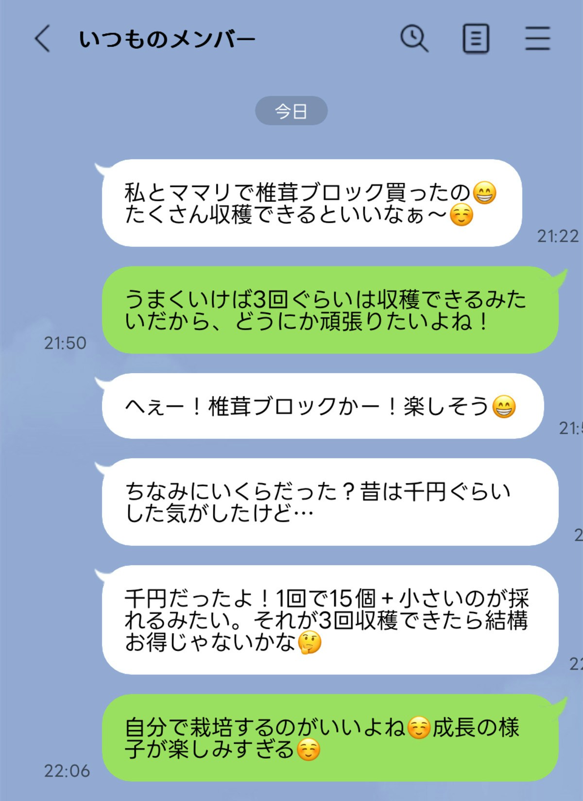 小学生時代から友達の3人のグループLINEがあり、そのうちの1人と私の2人で椎茸栽培ブロックを買いました。