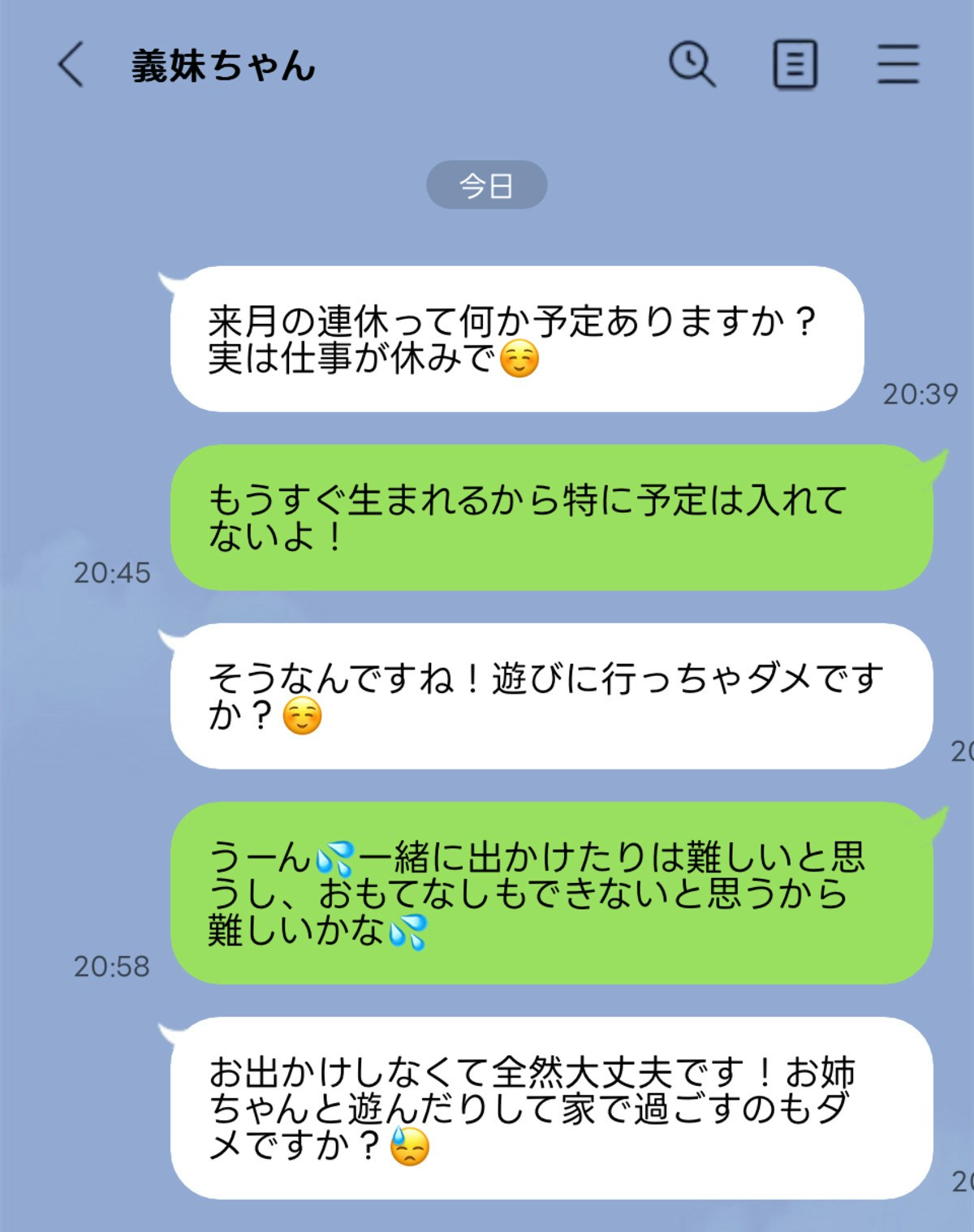 産前でお腹も大きく気持ちに余裕もないなかイライラする事が多く、義妹が連休に遊びに来たいという雰囲気をLINEで何回も出してくるのにすらイライラします。