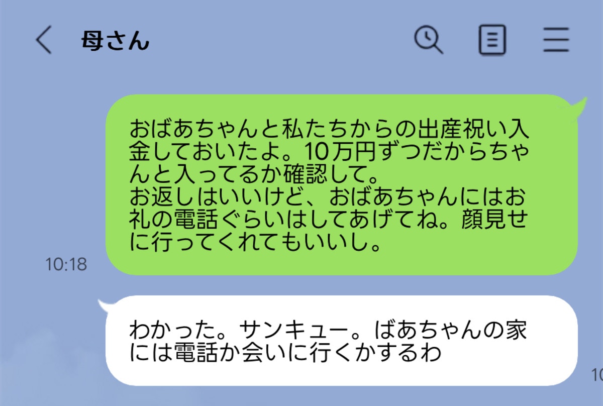 お祝い金は夫の口座に振り込んだそうで、義母が夫にLINEでその旨を伝えていました。